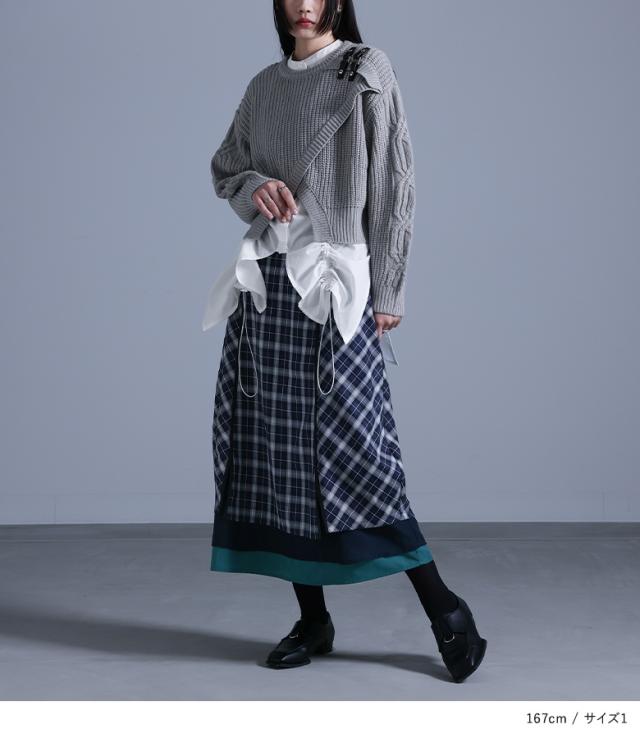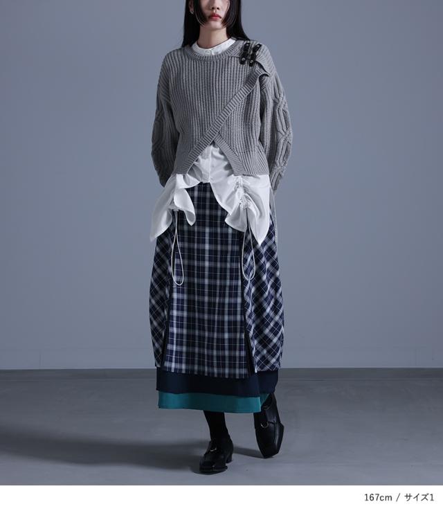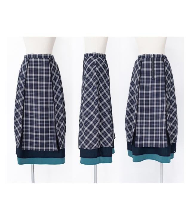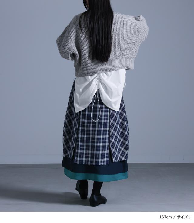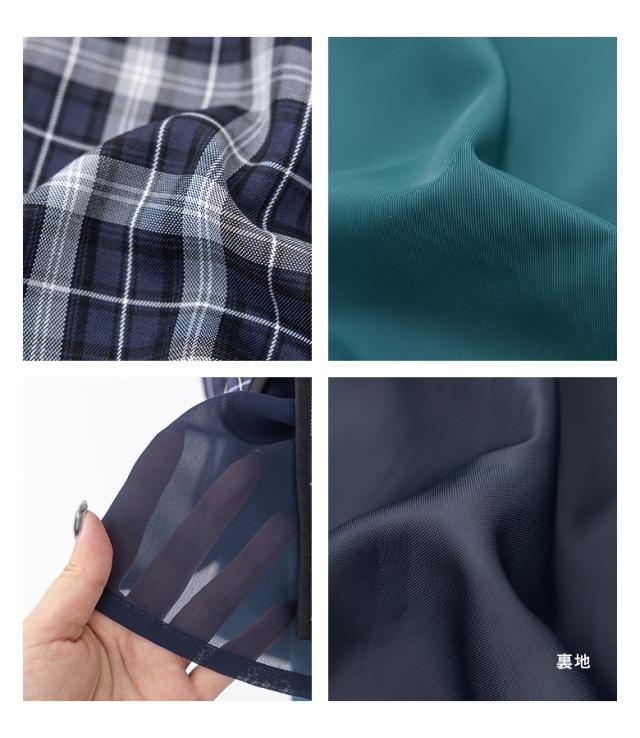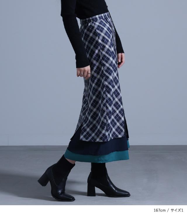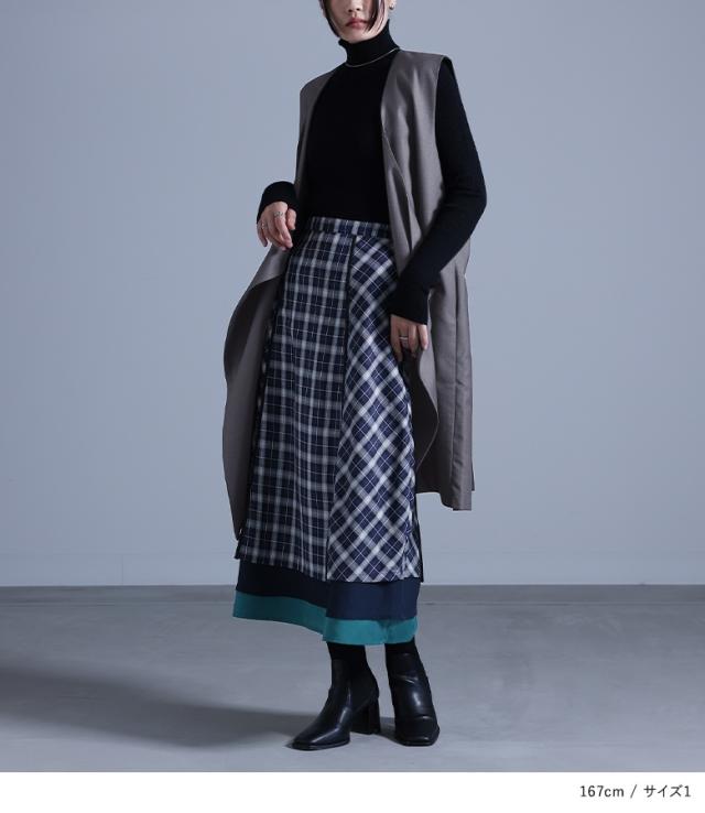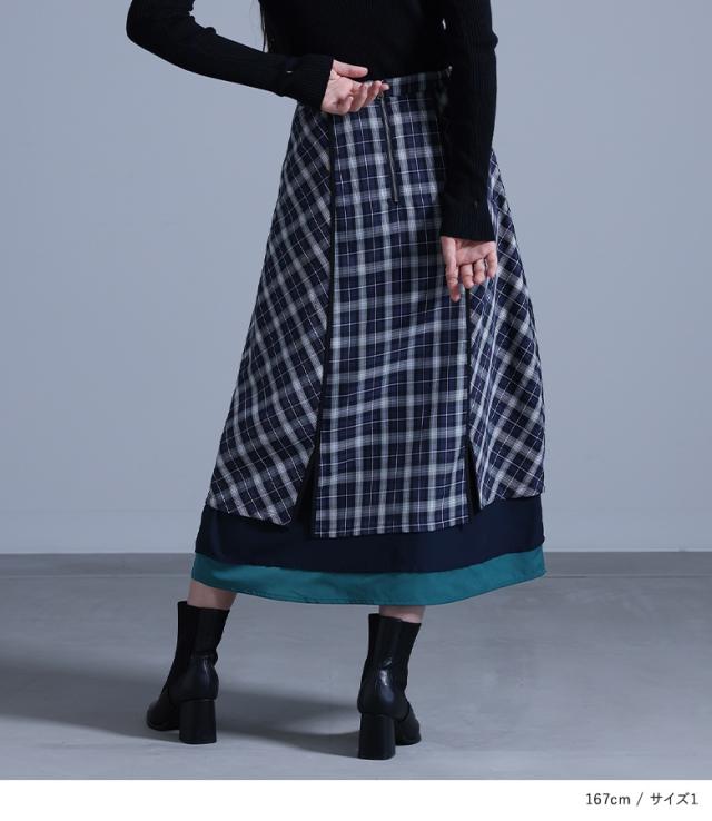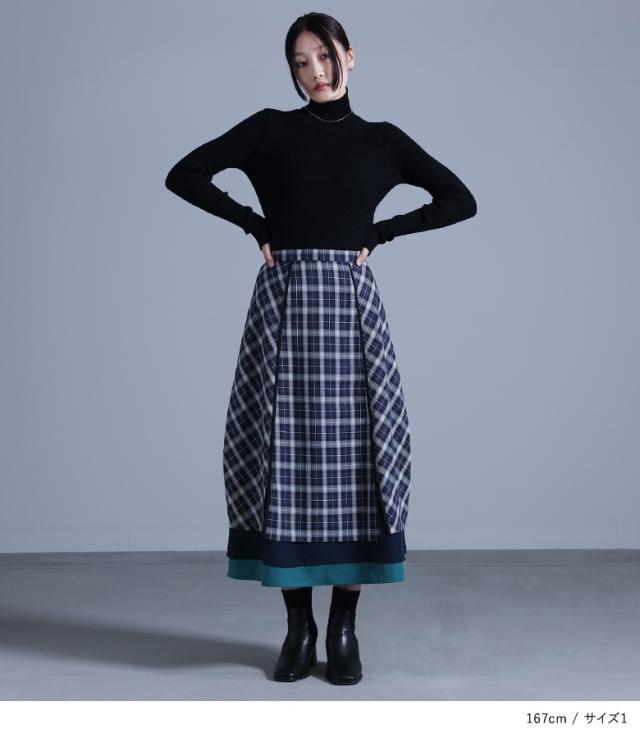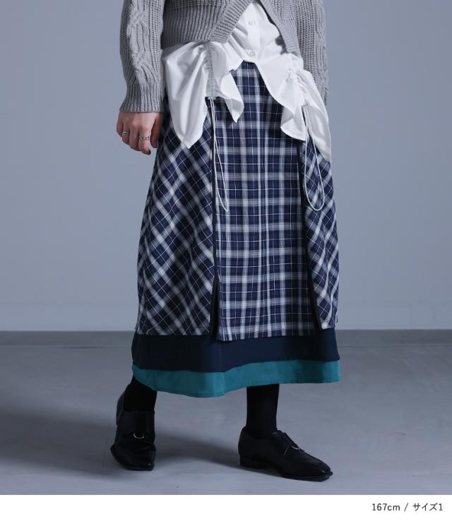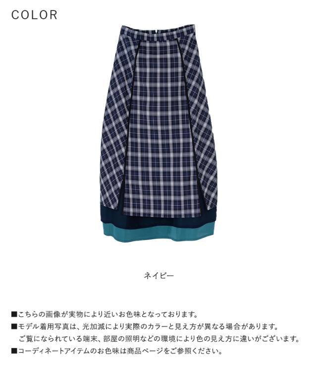 『異素材切替コクーンチェックスカート』※メール便可※【10】[ロング スカート レディース ボトムス コクーンスカート チェック柄 異素材 パイピング シフォン チェックスカート ロング丈 ファスナー 裏地付き]