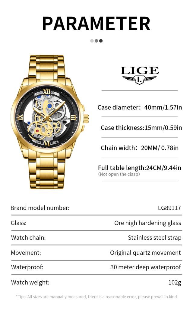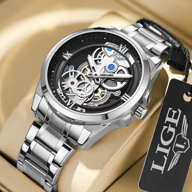 Lige-男性用透かし彫りクォーツ時計,ステンレス鋼バンド,発光時計,シンプルなファッション,ビジネス,高級ボックス