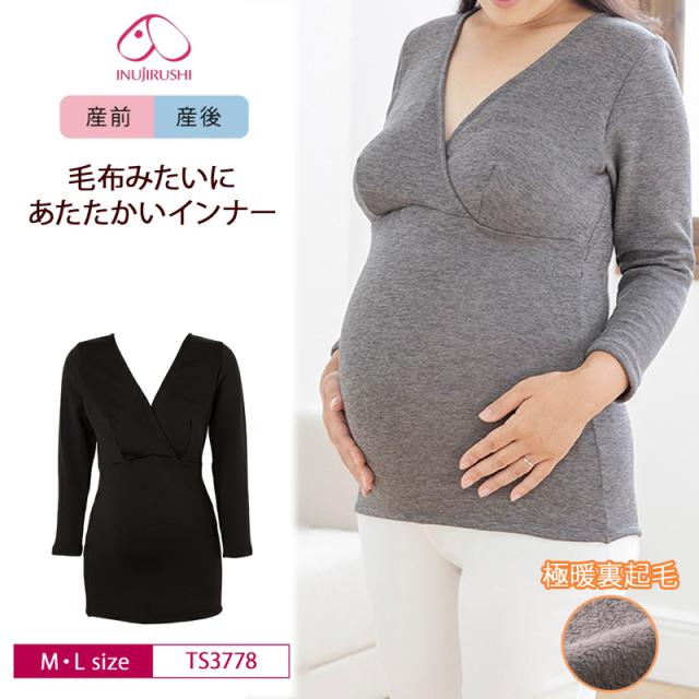 犬印 犬印本舗 INUJIRUSHI 産前産後兼用 産前 産後 マタニティ 毛布みたいにあたたかいインナー 8分袖 授乳インナー カップ付き あったか 裏起毛 (M・L サイズ) TS3778
