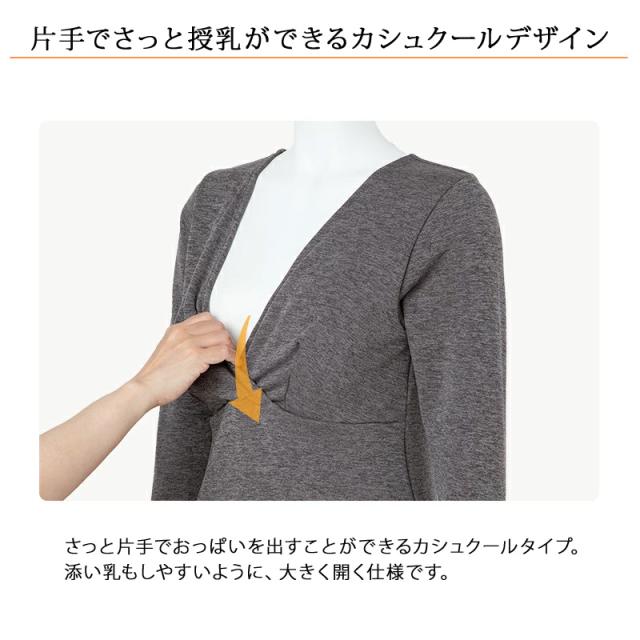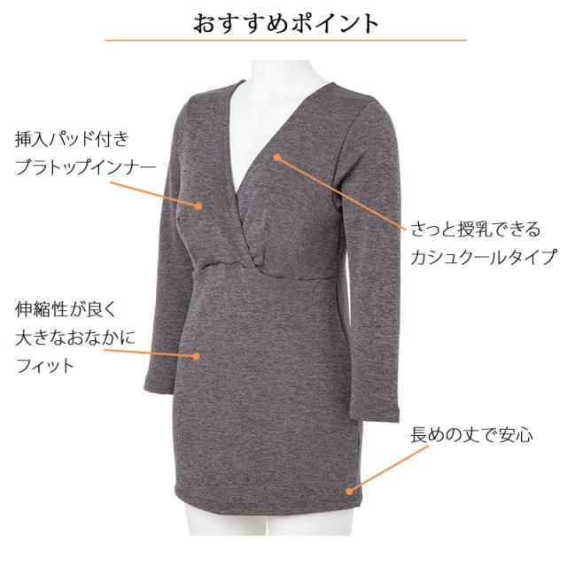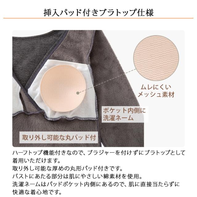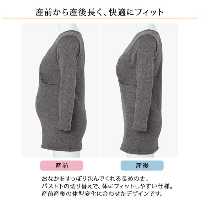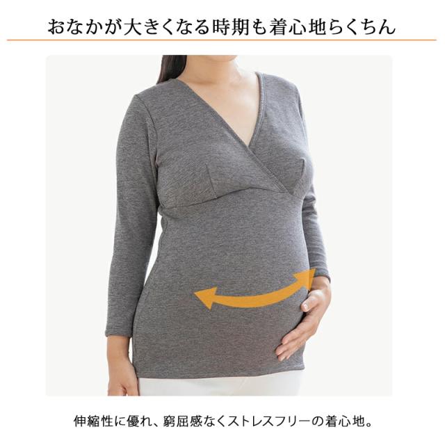 | 特徴 | 毛布みたいにあたたかいインナー 8分袖 産前産後兼用 あったか裏起毛授乳インナー(カップ付き) まるで毛布に包まれてるみたい♪ あったか裏起毛授乳インナー(8分袖) 内側は全面、毛布みたいな起毛生地で上半身をあたたかく包み込みます。 授乳しやすいカシュクールタイプなので、 胸もとを大きく開くことができて、おっぱいを出しやすいです。 臨月のお腹もすっぽり包む長めの丈で安心。 着心地のいい、あったか授乳インナーは寒くなる季節にマストな1枚! 毛布みたいにあたたかい 内側は毛布のような起毛生地 丸で毛布をまとっているような抜群のあたたかさ。 体が冷えがちな妊娠期、産後の夜間授乳時に上半身をあたたかく包み込みます。 ・挿入パッド付きブラトップ仕様 ハーフトップ機能付きなので、ブラジャーをつけずにブラトップとして着用いただけます。 取り外し可能な厚めの丸形パッド付きです。 バストにあたる部分は肌にやさしい綿素材を使用。 洗濯ネームはパッドポケット内側にあるので、肌に直接当たらずに快適な着心地です。 ・片手でさっと授乳ができるカシュクールデザイン さっと片手でおっぱいを出すことができるカシュクールタイプ。 添い乳もしやすいように、大きく開く仕様です。 ・お腹が大きくなる時期も着心地らくちん 伸縮性に優れ、窮屈感なくストレスフリーの着心地。 ・産前から産後 長く、快適にフィット おなかをすっぽり包んでくれる長めの丈。 バスト下の切り替えで、体にフィットしやすい仕様。 産前産後の体型変化に合わせたデザインです。 ・極暖裏起毛 表側はなめらか、内側は全面毛布のような起毛生地で体をあたたかく包み込みます。 しっかりあたためるので寒い日のインナーに最適です。 伸縮性に優れ、産前から産後のおなかにやさしくフィットします。 |