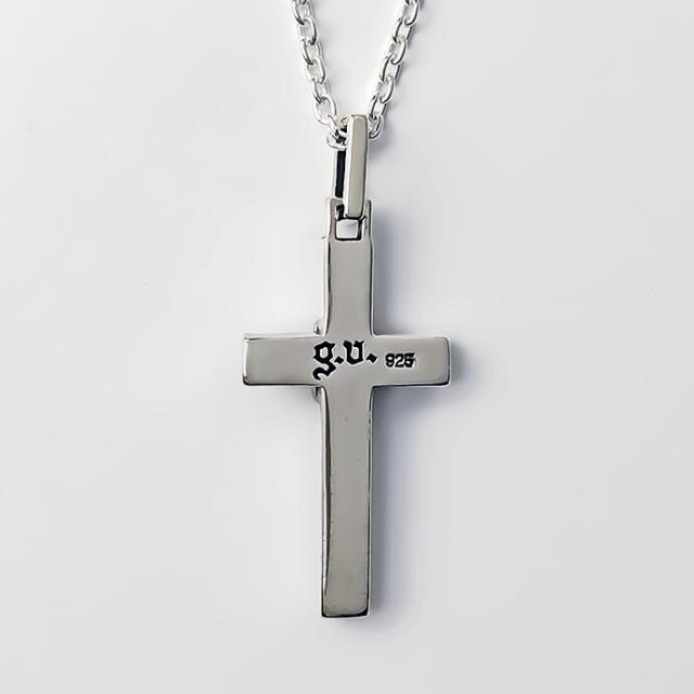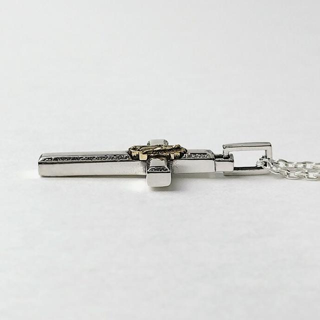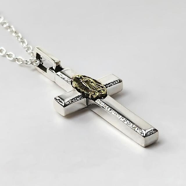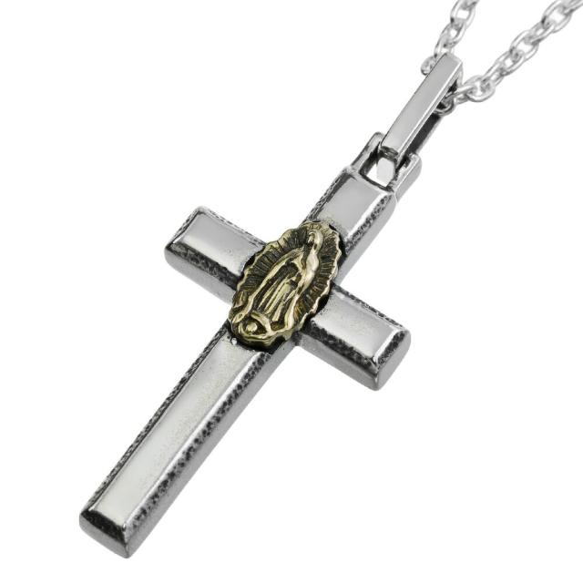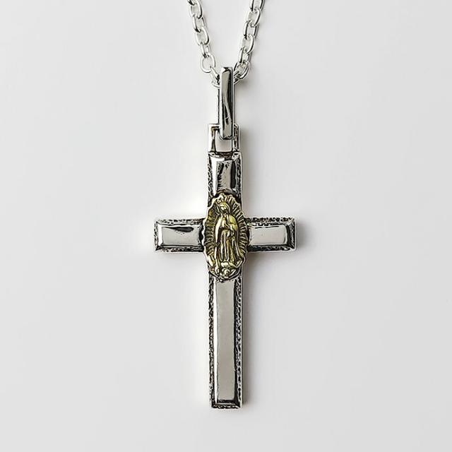 中央に金色のマリアメダイがデザインされたクロス(十字架)ペンダント。一見細めに見えるクロスですが厚みがしっかりとあるため、サイズ以上の満足感のある重みが楽しめます。クロス前面のエッジにざらりとしたテクスチャを施してワイルドさをプラスしているので、カジュアルコーデと合わせるのもオススメです。
