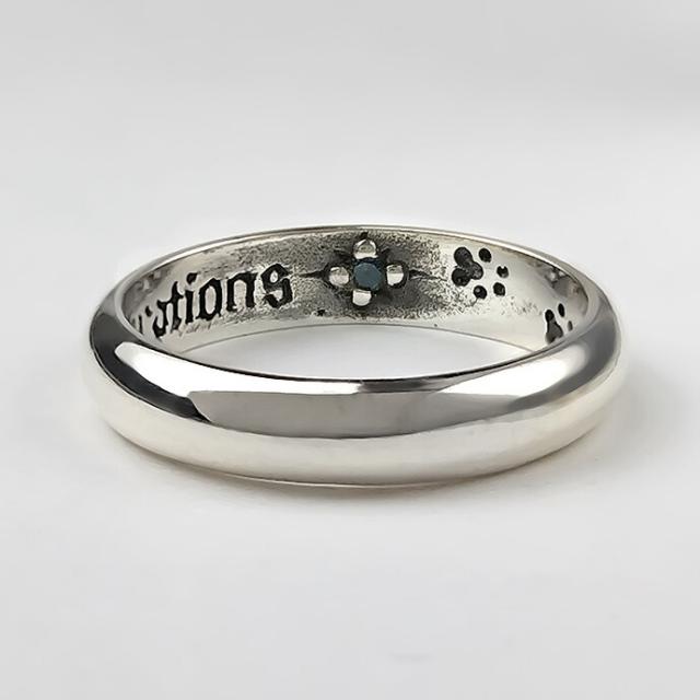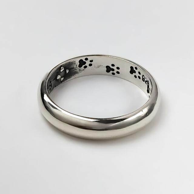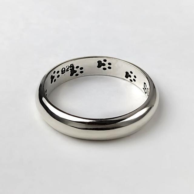 シンプルな甲丸リングの内側に猫の足跡が刻印されたリングです。足跡の横には落ち着きのある深い青色が特徴のロンドンブルートパーズが埋め込まれています。指にはめると普通の甲丸リング、外すとかわいらしいデザインが見える…、そんな自分だけの秘密を持つような遊び心が魅力のアイテムです。