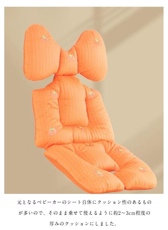 | かわいい刺繍デザインのコットン素材のベビーカー用クッション。 ベビーカー本体への汚れ防止にも、中綿入りのふんわりクッション。 表面は肌に優しいコットン生地、裏面は冬でも蒸れにくく通気性のいいメッシュ素材を使用しています。 ヘッドクッションの形は両サイドをやさしくガードするかわいい「リボン」型にしました 元となるベビーカーのシート自体にクッション性のあるものが多いので、そのまま乗せて使えるように約2〜3cm程度の厚みのクッションにしました。ベビーカーを折りたたんでも邪魔にならないちょうどいい厚み。お洗濯しても乾きやすいのもメリットですよね。 | |