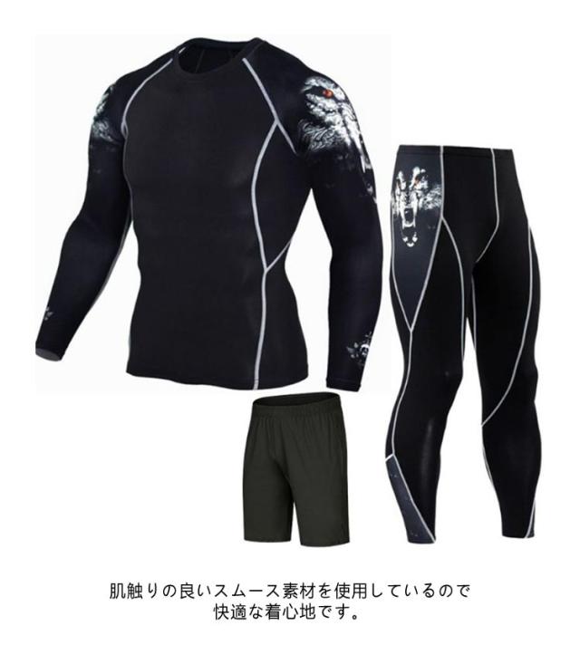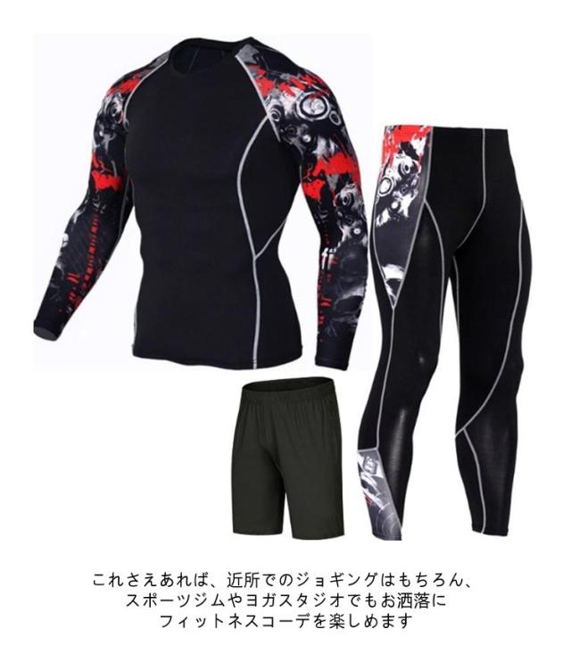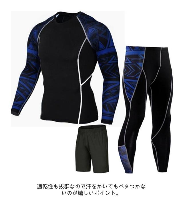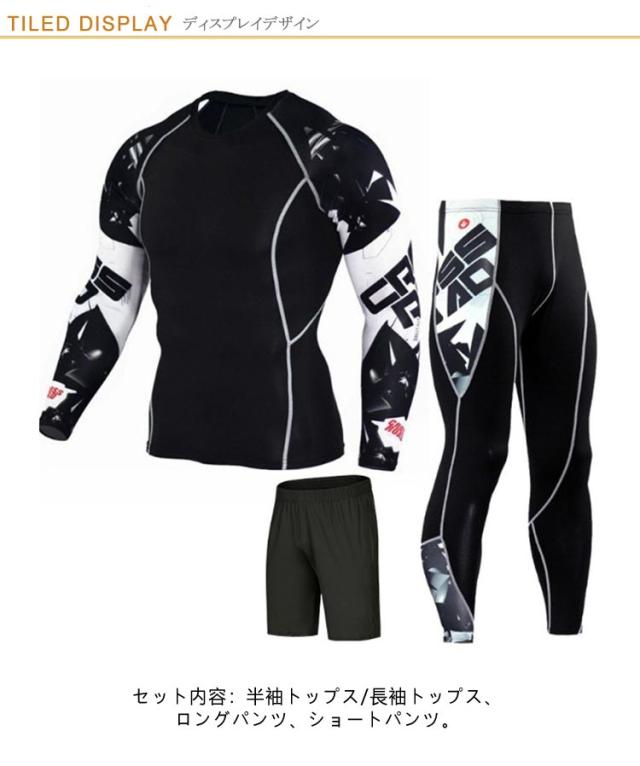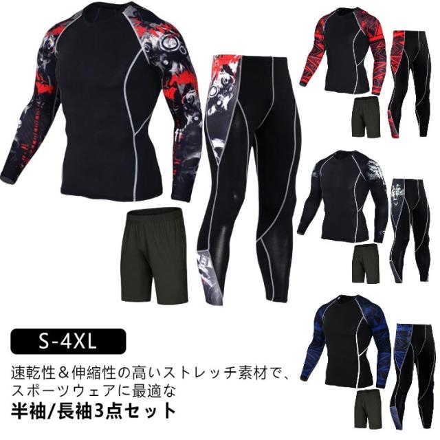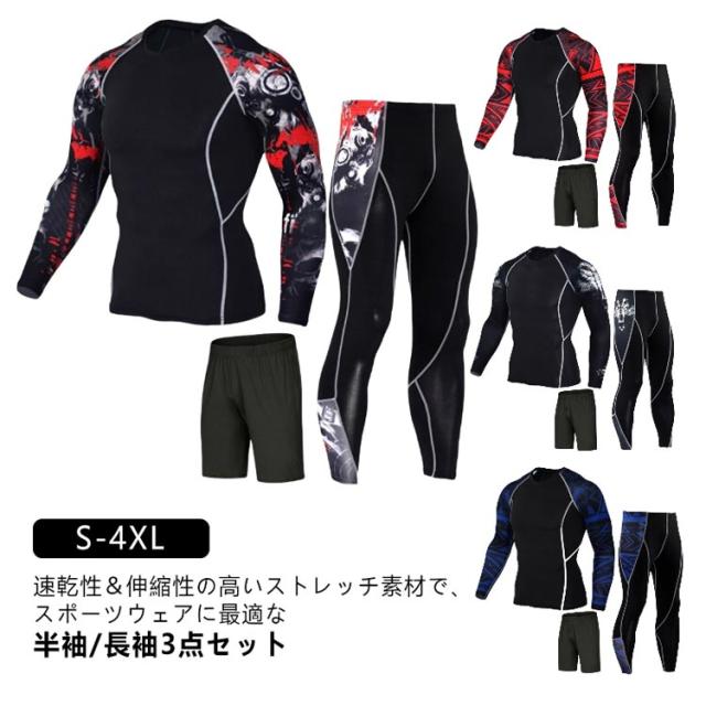 S-4XL スポーツウェア 上下 3点セット 配色 メンズ トレーニングウェア ジム ウェア 半袖 トップス 長袖 シャツ パンツ 上下セット 幾何学柄 ライン入り ランニングウェア フィットネスウェア ヨガウェア ジョギング 【送無】