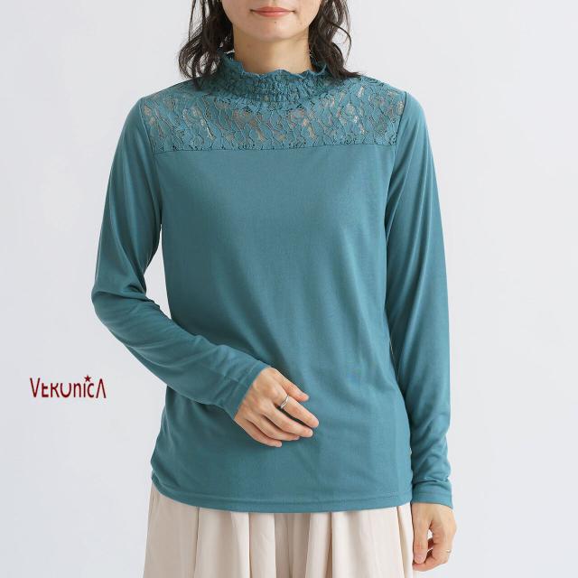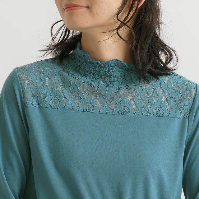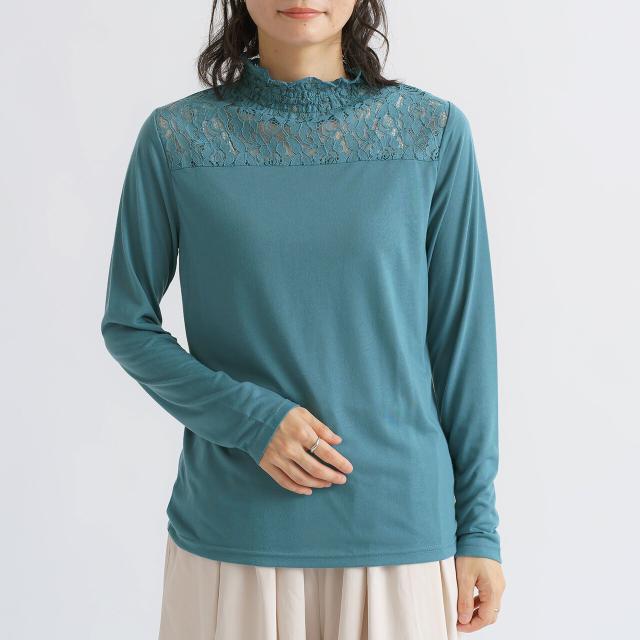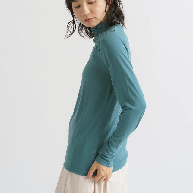 可愛らしいレースで切替されたハイネックトップス。シャーリング衿のデザインでアウターの中に着てチラ見せすることでオシャレ度がアップします。