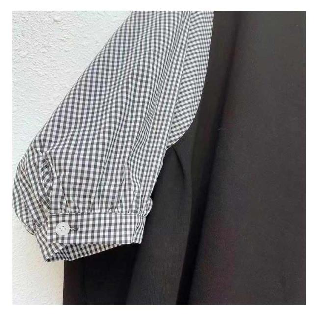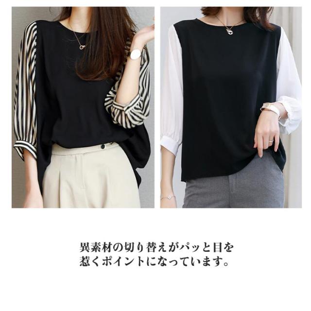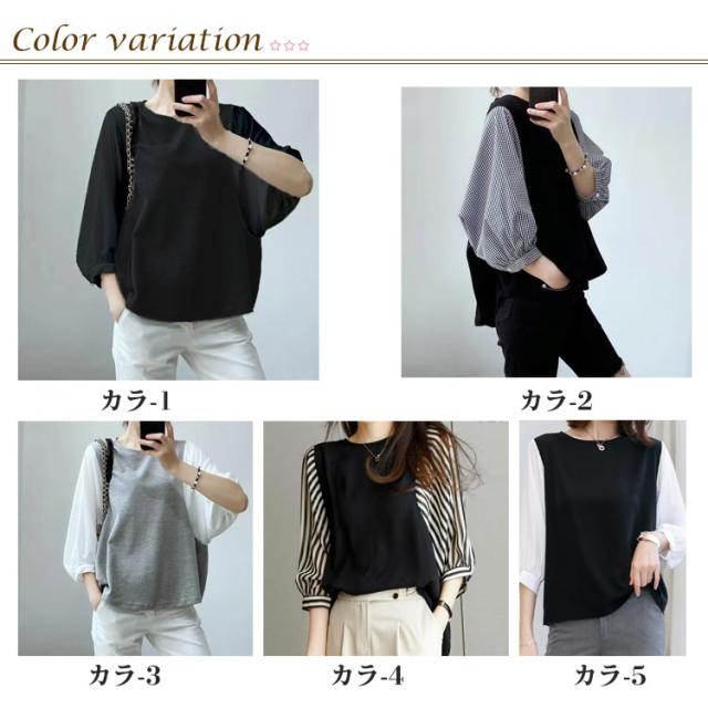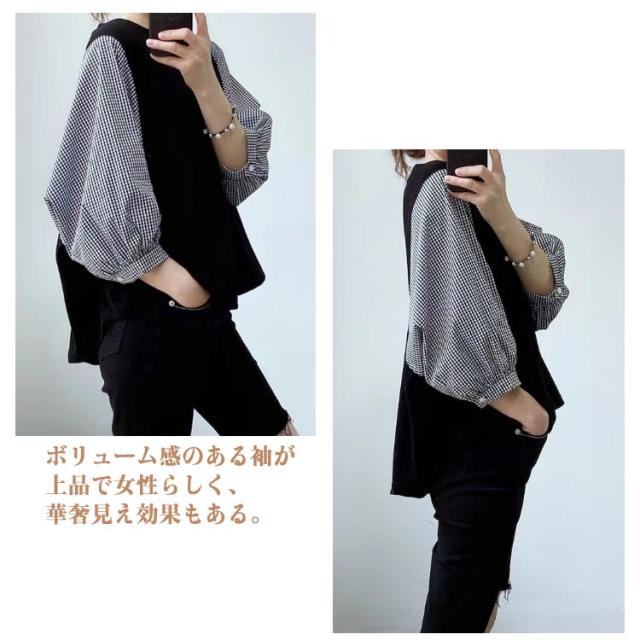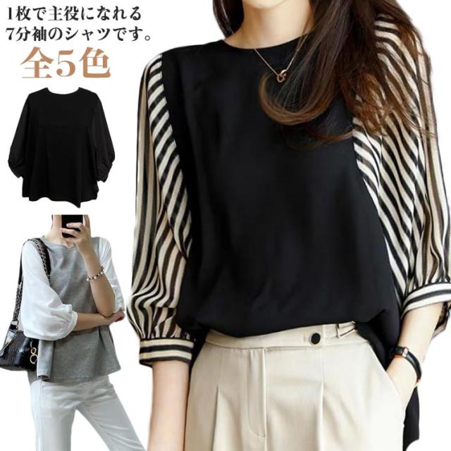 七分袖 トップス レディース ブラウス クールネック 春夏秋 チェック柄 ストライプ 切り替え シャツ 着痩せ ブラウス カジュアル 普段着 通勤 オフィス お洒落 体型カバー 柔らかい