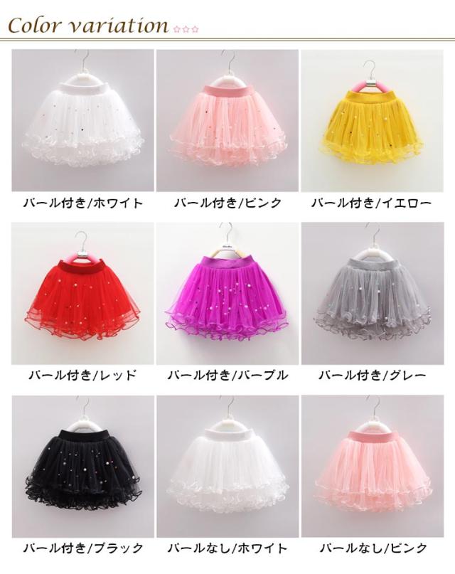 | かわいいフレアのチュールスカート パールがポイントでとっても可愛い!! 裾のひらひら感がお姫様気分になれる1枚ですね☆ ウエストも幅広めのゴム仕様でトップスインも◎快適に着用いただけます。 選べる2タイプ、ニーズに合わせて選びいただけるのがうれしい♪ 発表会・結婚式・お誕生日会・記念撮影や衣装、コスチュームやパーティ、そして、普段使いにもおすすめ♪ | |