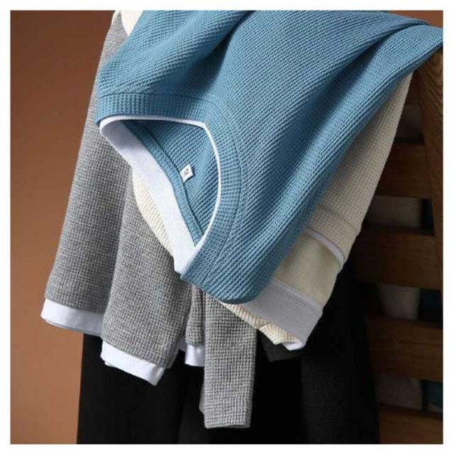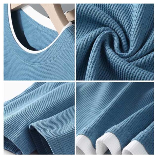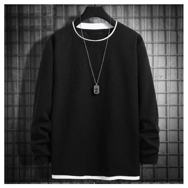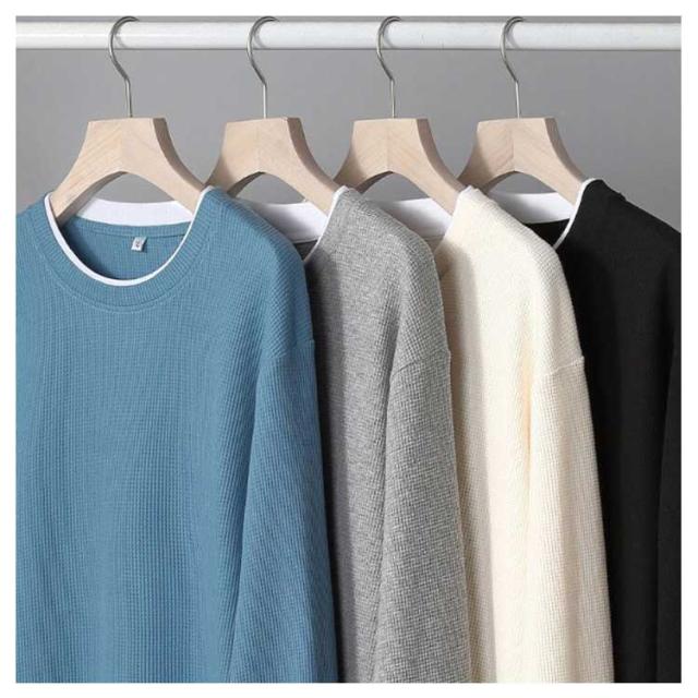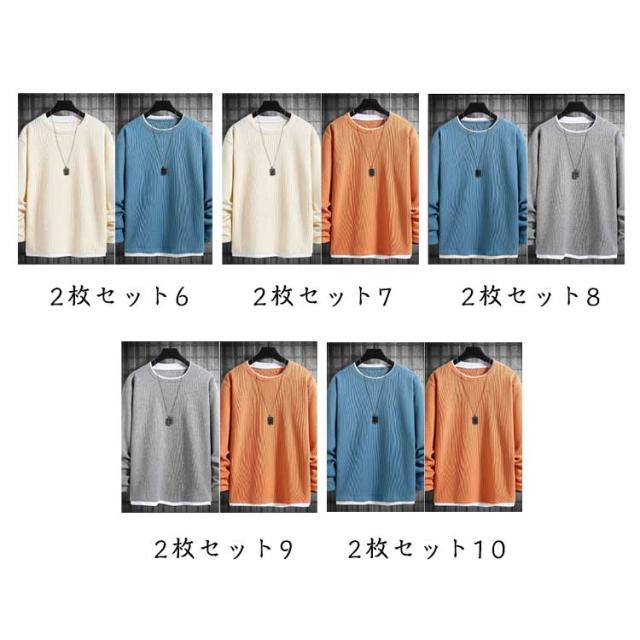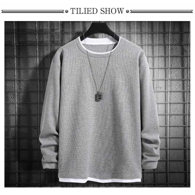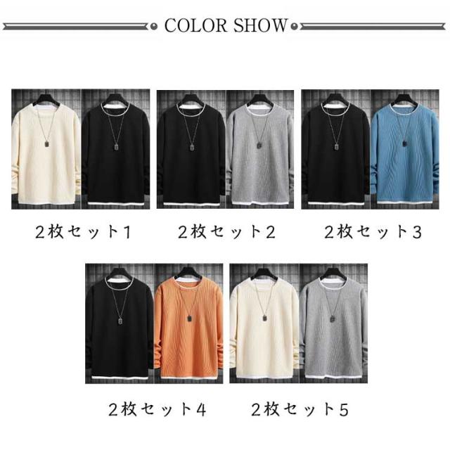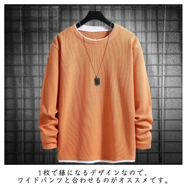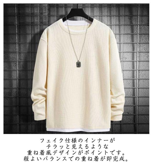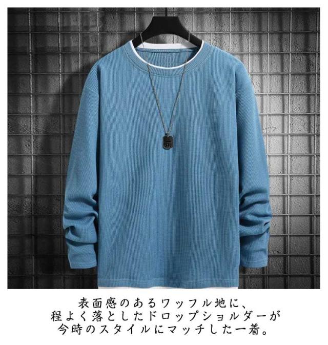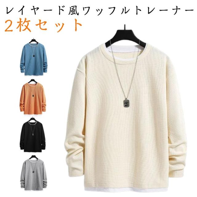 Tシャツ メンズ プルオーバー トレーナー トップス 長袖 ワッフル 2枚セット おしゃれ カットソー レイヤード 2枚セット ドロップショルダー クールネック 重ね着風 ゆったり 無地 秋 冬 ルームウェア カジュアル シンプル
