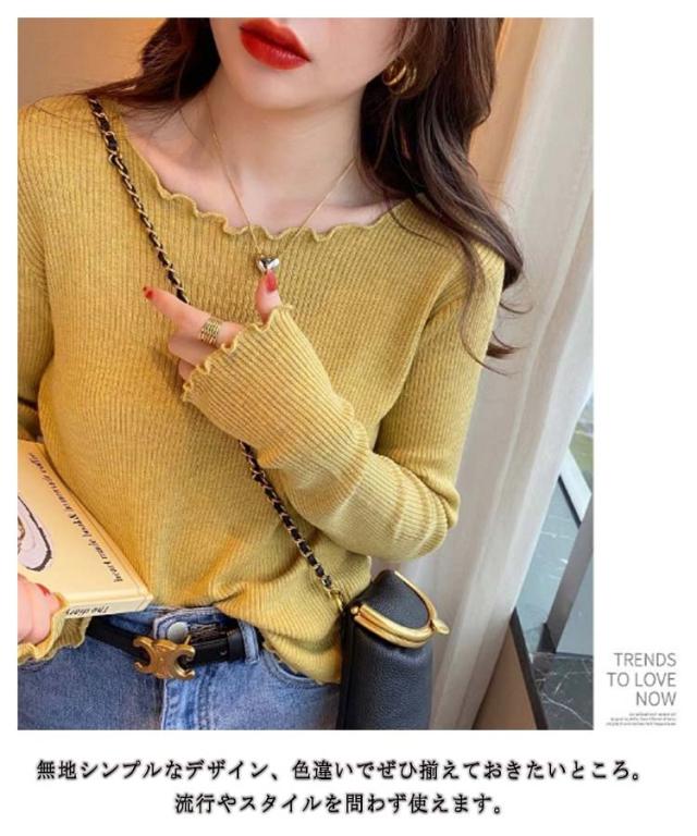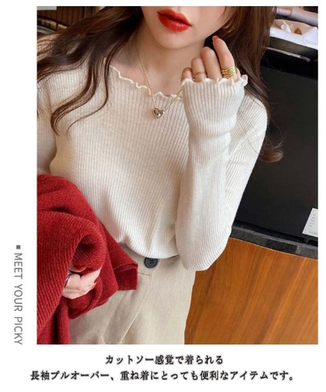 柔らかい ストレッチ 長袖 カットソー リブニット ニットセーター ボートネック レディース インナーウェア フリル 秋 冬 春 プルオーバー 肌着 リブニット シンプル エレガント セクシー きれいめ