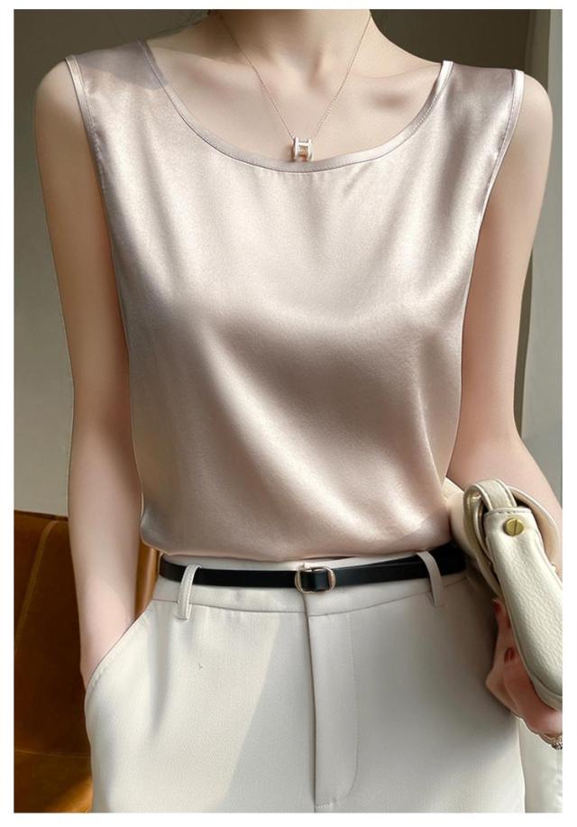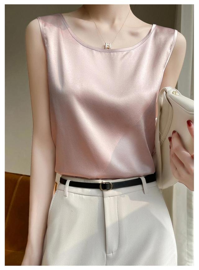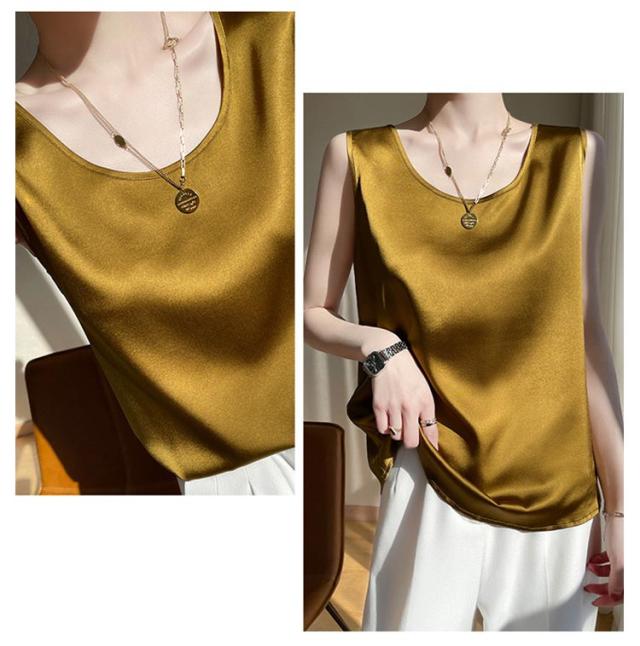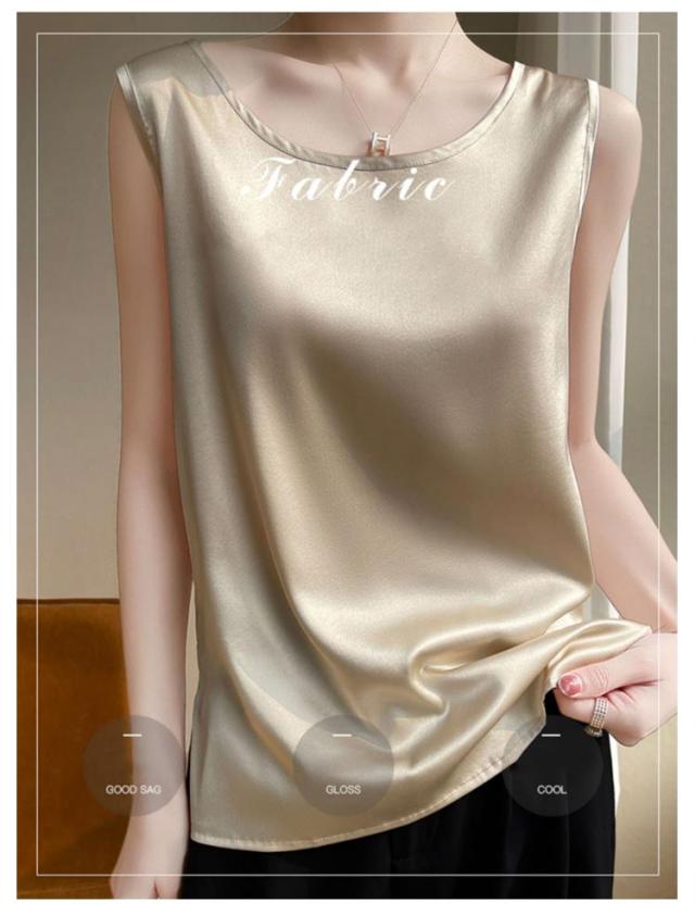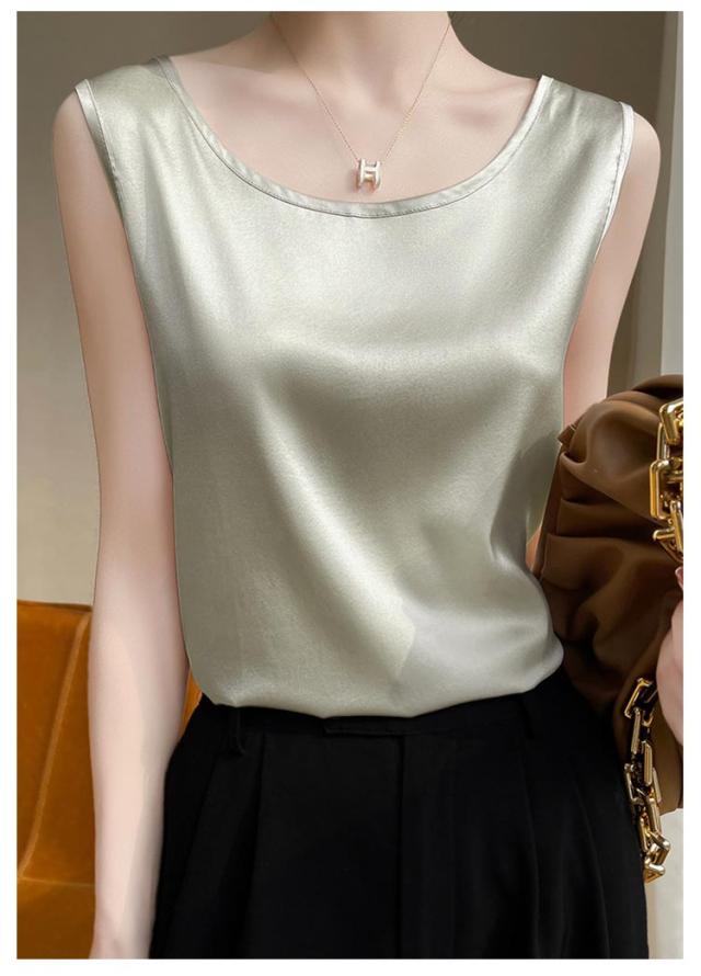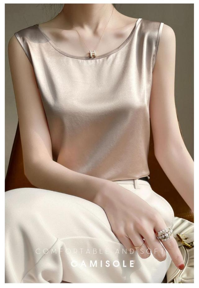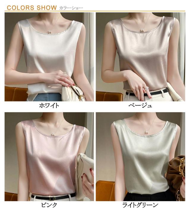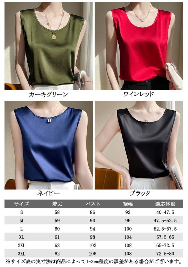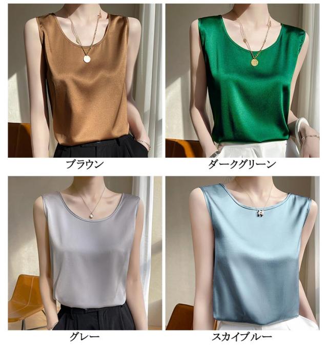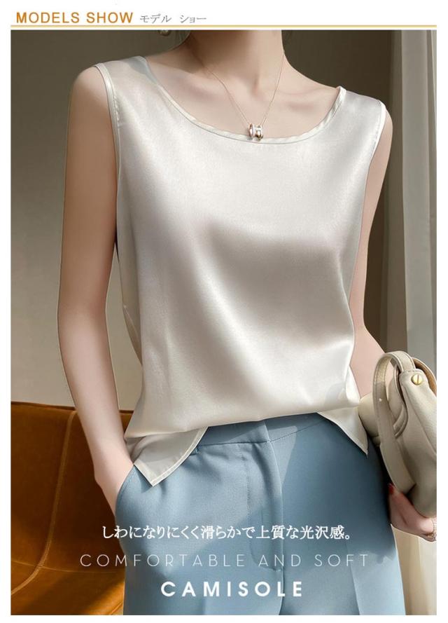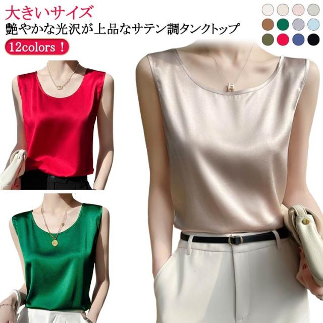 大きいサイズ ラウンドネック トップス 肌着 重ね着 ゆったり 上品 ブラウス サテン シルク調 トップス ショート丈 インナー 透けない 春夏 光沢感 ツルツル レディース ブラ紐隠し 薄手 タンクトップ 大人 無地 OL オフィス ノースリーブ 母の日