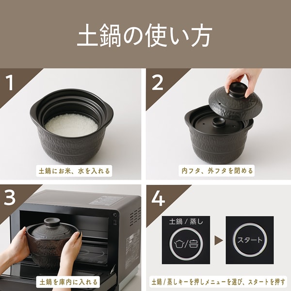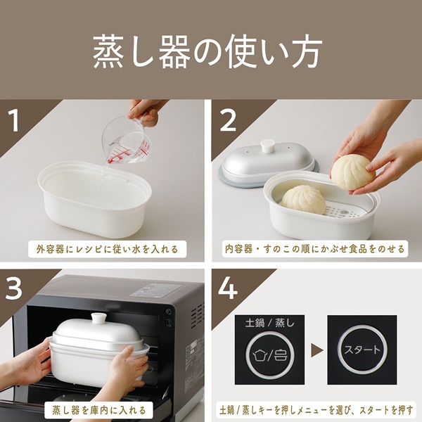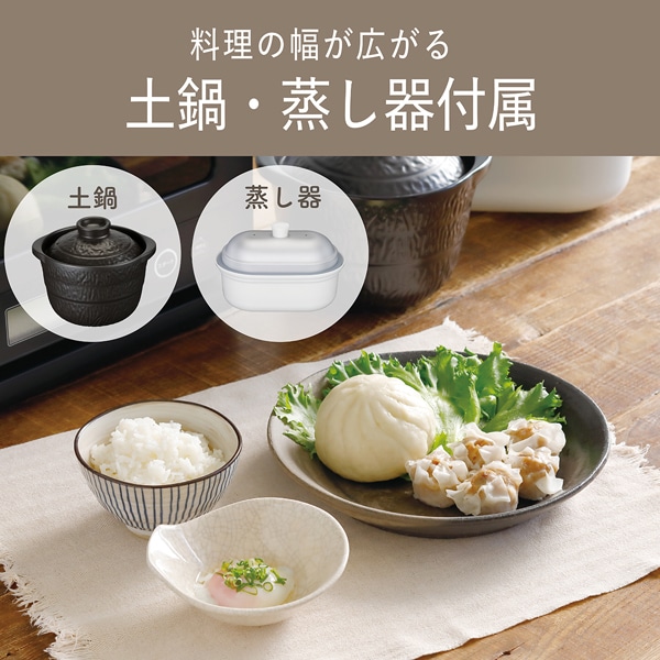 電子レンジで炊飯・調理が可能な土鍋と本格的な蒸し料理が楽しめる蒸し器が付属