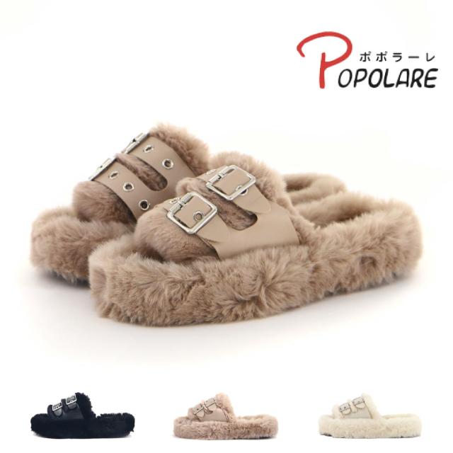 【30%OFF】 レディース サンダル ダブルベルトファーサンダル もこもこ ふわふわ スリッパ ルームシューズ ポポラーレ POPOLARE 外履き 厚底 厚底サンダル ダブルベルト かわいい 韓国 韓国ファッション