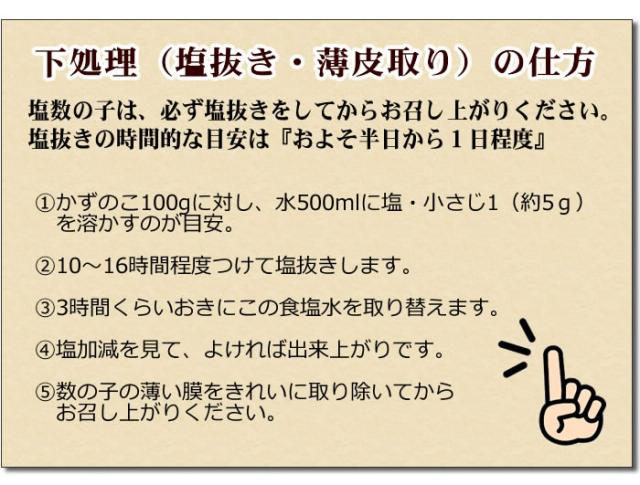 | 注意事項 | 塩抜きしてお召し上がり下さい。(※薄皮なし) |