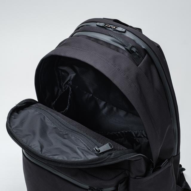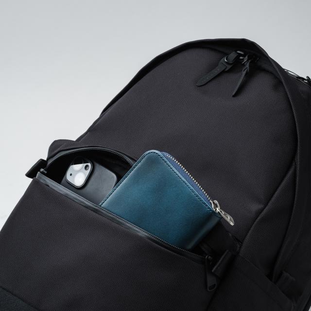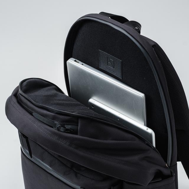| 休日シーンを中心に、持ち歩くアイテムをリサーチしたうえで、何をどこにしまうか。十分な容量を確保しながら適切な位置が計算しつくされた収納配置を設計しました。 Pickup まずご紹介したいのは、外側からは気付かれにくく防犯性のある隠しポケット。ゴーストポケットと名付けました。マグネットによるワンタッチ開閉で手元の荷物を出し入れしやすく、電車や店舗などで前背負いした際、抜群の使いやすさとなります。大型の携帯電話や文庫本、長財布も横向きに収納可能です。 メインルームはこれまでに無い収納力を実現。雑誌や弁当箱、ノート類に加え、トップスからボトムまで着替えも収納出来ます。買い物帰りのお荷物もスムーズに収納可能になります。 メインルーム内には、折り畳み傘やステンレスボトルも収納出来るナローポケットも配置。メインルーム内には、折り畳み傘やステンレスボトルも収納出来るナローポケットも配置。ナローポケットのうち1つはスナックポケットを採用、コンビニなどで購入した軽食などを他の荷物と分けて収納が出来ます。 サイドポケットにも折り畳み傘やステンレスボトルが収納出来ますのでお好みに合わせて選択が出来ます。サイドポケットには伸縮性のある生地との切り替えを行う事で出し入れをスムーズにサポートします。PCルームは別ルーム式を採用。プライベートな荷物とルームを分ける事で大切なガジェットを守ります。また全体にクッション性のある起毛素材を使用し、底部分には特殊な棒状の芯材を配置しました。底上げを図ることで、PCやタブレットが床にあたりません。 |
