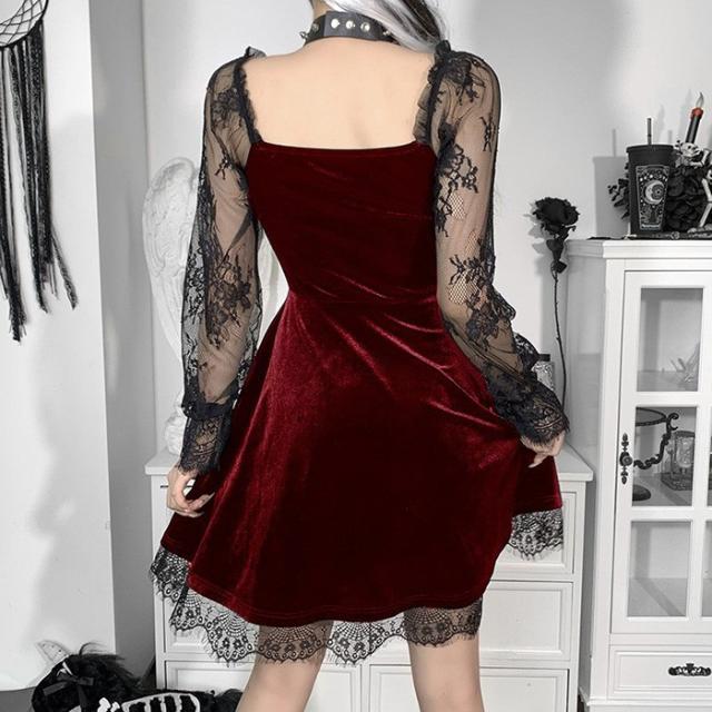 ワンピース レディース セクシー 長袖 ダークゴシック キャミワンピ レース ナイトクラブ バー コスプレ衣装 舞台衣装 ブラック ワインレッド ハロウィン コスプレ 大人 ボリュームスカート ロリータdh015lclcm5