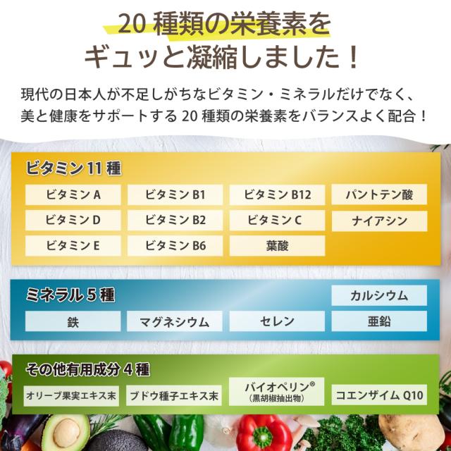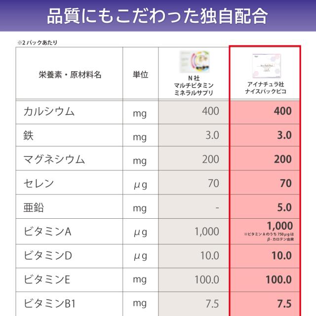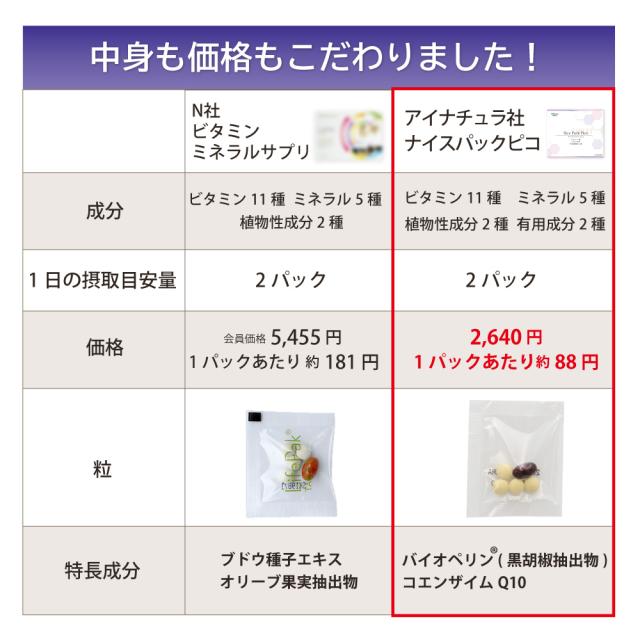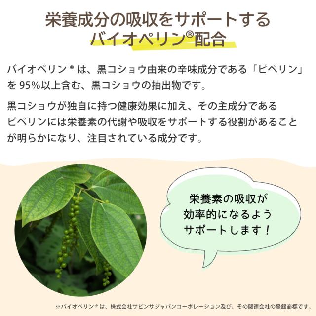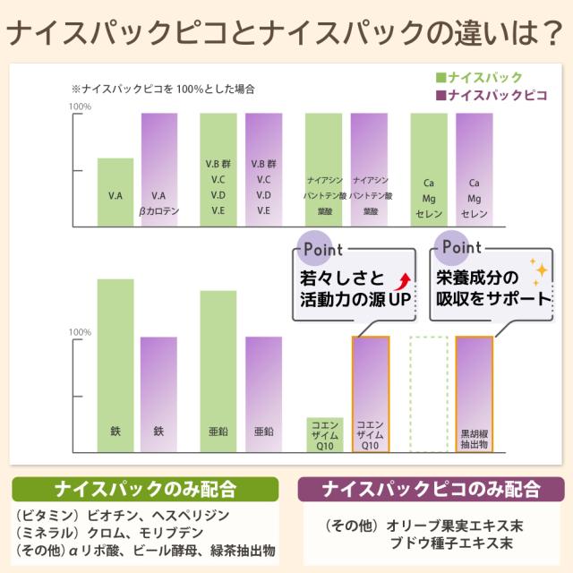 ナイスパックに比べて飲みやすく、マルチビタミン・ミネラルに加えて、コエンザエムQ10を増量、さらに黒胡椒抽出物も配合。