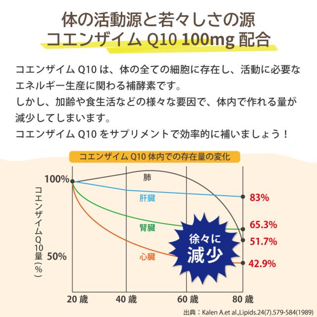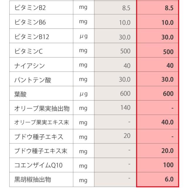 黒胡椒抽出物:6.0mg、オリーブ果実エキス末:40.0mg、ブドウ種子エキス末:20.0mg、コエンザイムQ10:100mg