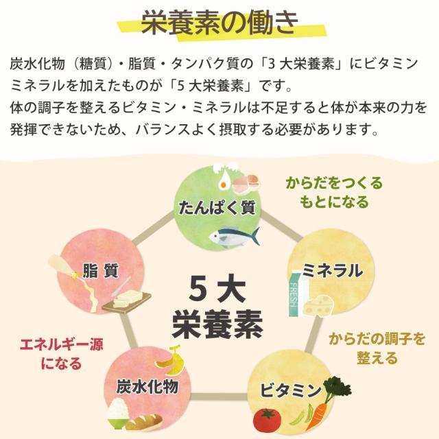 たんぱく質:0.47g、脂質:0.41g、炭水化物:1.29g、食塩相当量:0.0011g、カルシウム:400.0mg、鉄:3.0mg、マグネシウム:200.0mg、セレン:70.0μg、亜鉛:5.0mg、ビタミンA:1000.0μg※、ビタミンD:10.0μg、ビタミンE:100.0mg、ビタミンB1: 7.5mg、ビタミンB2: 8.5mg、ナイアシン:40.0mg、ビタミンB6: 10.0mg、パントテン酸:30.0mg、ビタミンB12:30.0μg、葉酸:600.0μg、ビタミンC:500.0mg