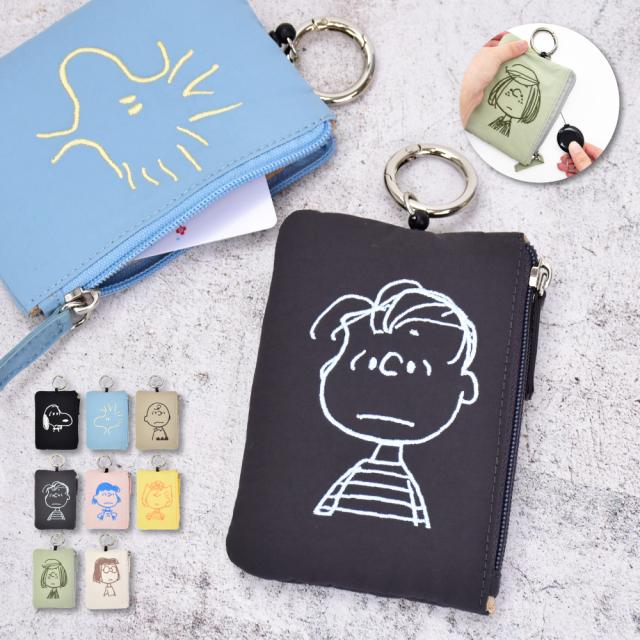 スヌーピー ピーナッツ パスケース 定期入れ リール付き カラビナ キーケース 鍵ケース 小銭入れ ファスナー 小物入れ フェイス 刺繍 シンプル コンパクト 通勤 通学 旅行 塾 電車 自転車 大人 高校生 学生 小学生 子供 かわいい 可愛い キャラクター グッズ