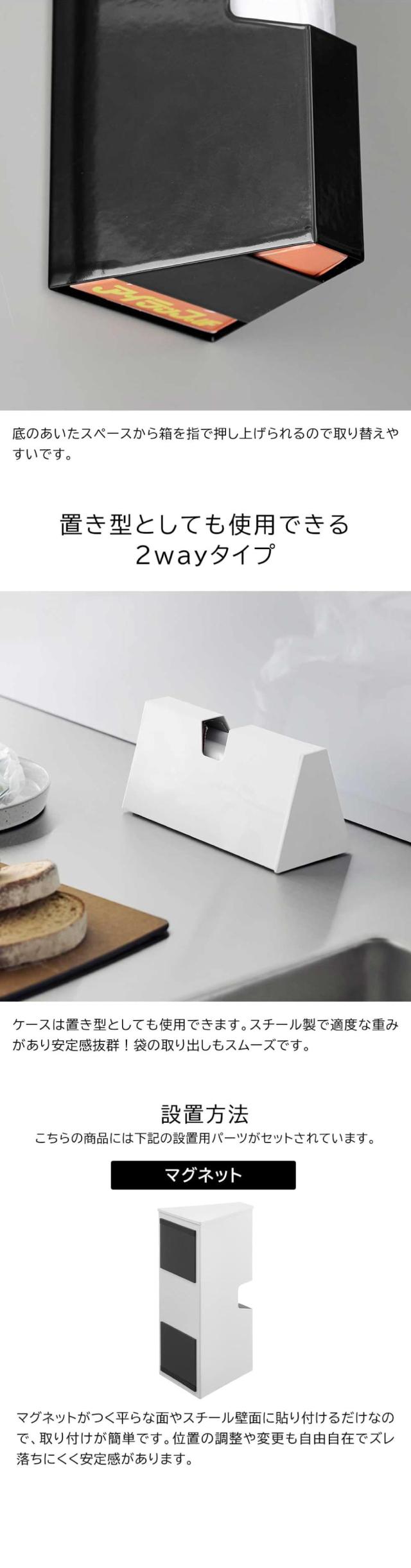 マグネットで簡単設置。調理用ポリ袋を箱ごとセットできるケース。パッケージが見えずスッキリとした見た目に。ケースに重みがあるので安定感があり、置き型でも使いやすい。