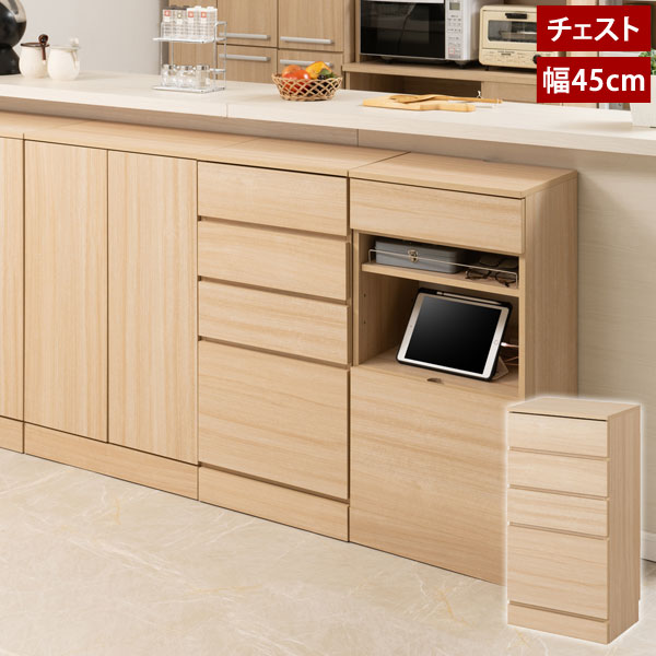 上品な木目が大人気の【MARINE】マリンシリーズ。鮮やかなナチュラルカラーは、綺麗な木目が北欧テイスト感を醸し出しています。リビング・キッチン・寝室・子供部屋がさわやかな木の温かみを感じられる空間に。カウンター下のデッドスペースを造り付けの様なスッキリした収納庫で大量収納。引出しタイプと幅の3種類ある扉タイプでカウンター下のスペースと収納物に合わせてお選び頂けます。幅45cmのチェストは下段の深い引出しと3杯の引出しの計4杯。こまごましたものを小分けしてきれいに整理整頓ができます。引き出しが抜け落ちないように落下防止のストッパーが付いています。