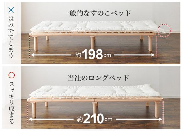 一般的なベッドはマットレス用のサイズが多いですが、敷布団が収まるロングサイズを採用しています。
