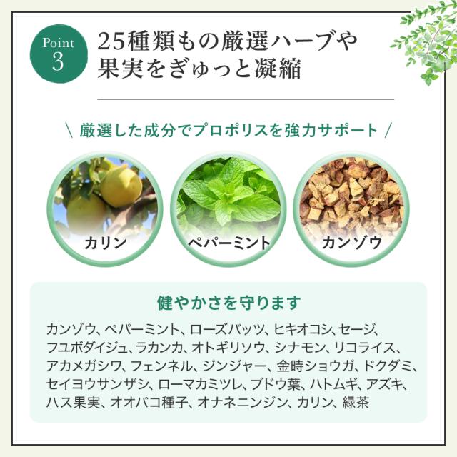 プロポリスの有用性をより高めるため、様々な研究が進められている天然由来の成分(カンゾウエキス、ローズバッツエキス、ハーブエキス、緑茶エキス)を凝縮。