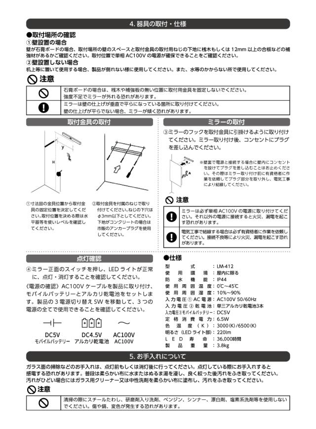 IP44 ※本製品は防水仕様ではありません。 破損や事故の原因となりますので浴室など、水のかかりやすい場所には取り付けないでください。 | |