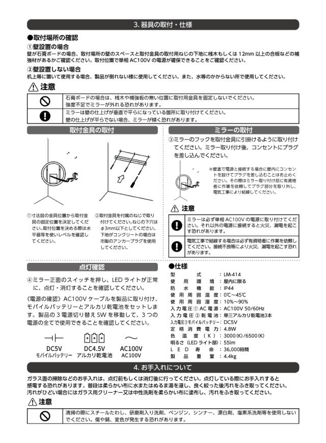 IP44 ※本製品は防水仕様ではありません。 破損や事故の原因となりますので浴室など、水のかかりやすい場所には取り付けないでください。 | |