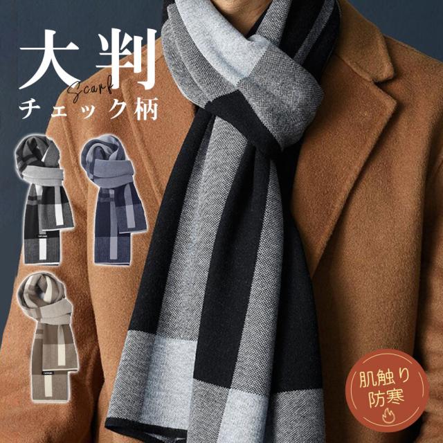 【即納】マフラー メンズ カシミヤタッチ チェック柄 大判 防寒 防風 暖かい ふわふわ 柔らかい 肌触り 無事 シンプル 通勤 冬 コー