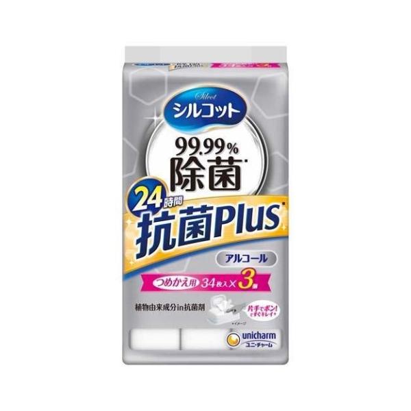 ユニ・チャーム シルコット 99.99%除菌 抗菌プラス ウェットティッシュ アルコールタイプ 詰替 34枚×3/ウェット 詰替(4903111437108)
