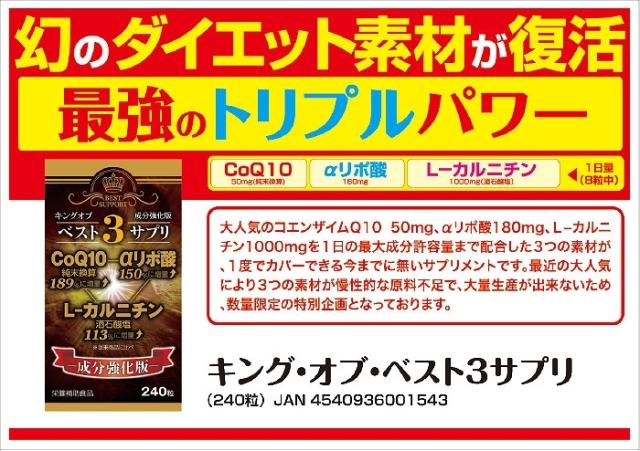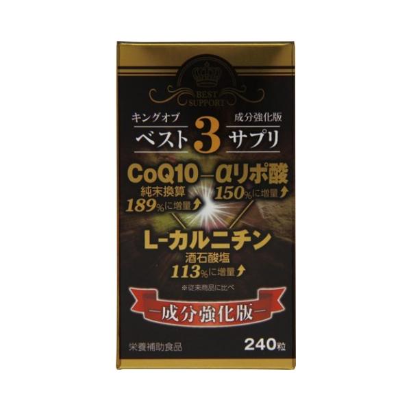 ダイエット&健康サポートの3成分「CoQ10」「αリポ酸」「カルニチン」をバランス配合。従来品に比べ成分を強化しました。年齢と共にカラダで減少する3成分だからこそ“ベスト3サプリ成分強化版”!アクティブ生活を応援します。