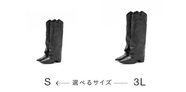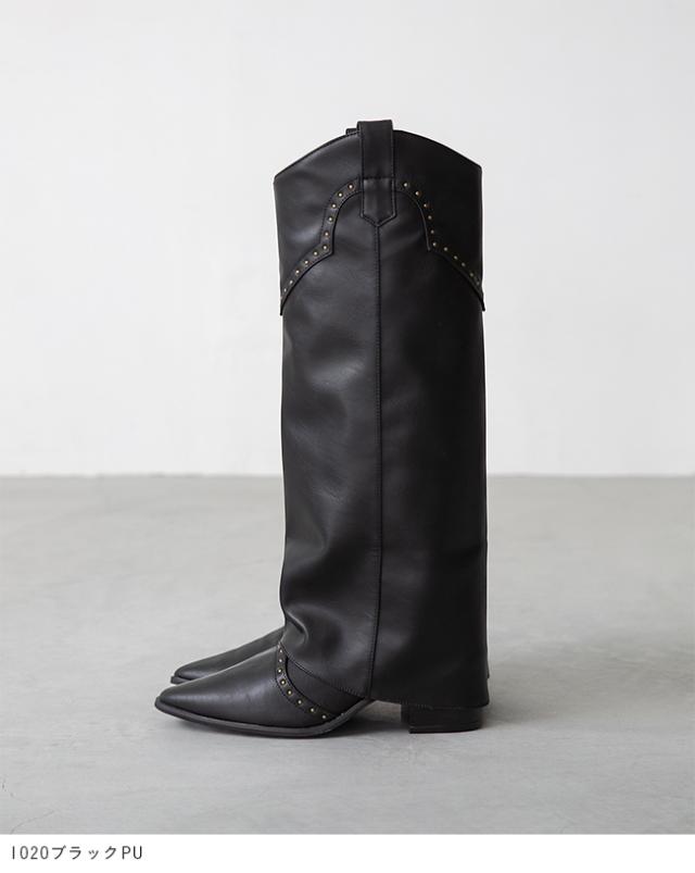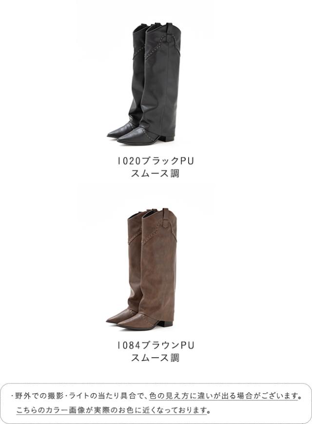 ブーツ ロングブーツ ロング ロング丈 膝下 レディース ポインテッドトゥ ポインテッド とんがりトゥ ウエスタンブーツ ウエスタン ヴィンテージ ヴィンテージ風 スタッズ ワイド ワイドブーツ チャンキーヒール 太ヒール チャンキー 太めヒール デザインヒール 変形ヒール ヒール 高め 美脚 スタック調ヒール スタックヒール プリントスタックヒール 木目調 高反発クッション 高反発 クッション すべりにくい 痛くない 歩きやすい 疲れない 疲れにくい 大きいサイズ 小さいサイズ 幅広 あったか 雪 雪の日 防寒 デート おでかけ お出かけ カフェ ショッピング 買い物 屋外 外履き デイリー 日常 普段使い 日常使い 普通履き 6cmヒール 6センチヒール ミドルヒール 3E 黒 ブラック 茶 ブラウン S 22cm 22.5cm M 23cm 23.5cm 2L LL 25cm 25.5cm 3L LLL 26cm L 24.cm 24.5cm 秋 冬 スムース調 合皮 PU menue メヌエ outletshoes アウトレットシューズ welleg ウェレッグ