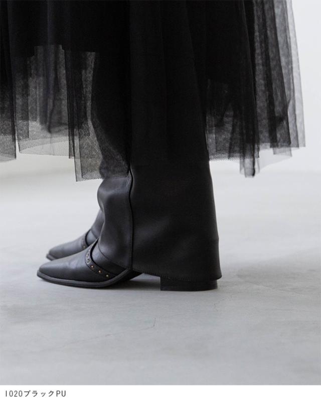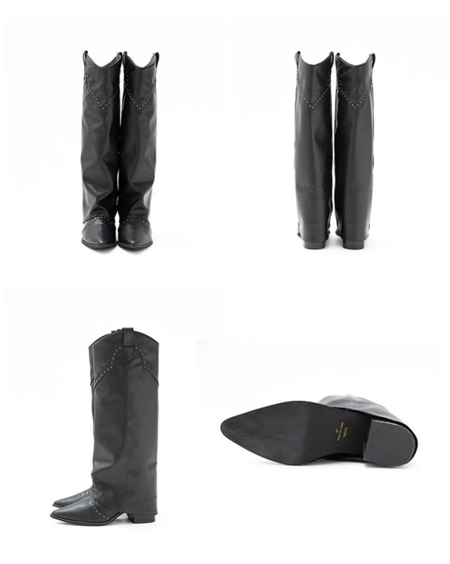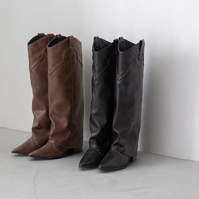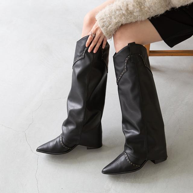 特徴的なデザインのウエスタンブーツに、ヴィンテージ風なスタッズがおしゃれなアクセント。