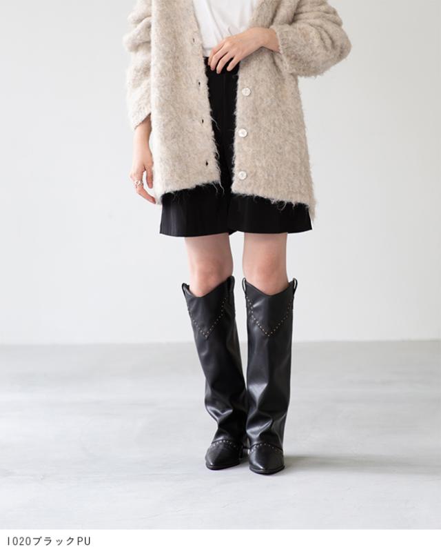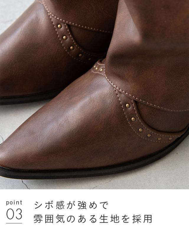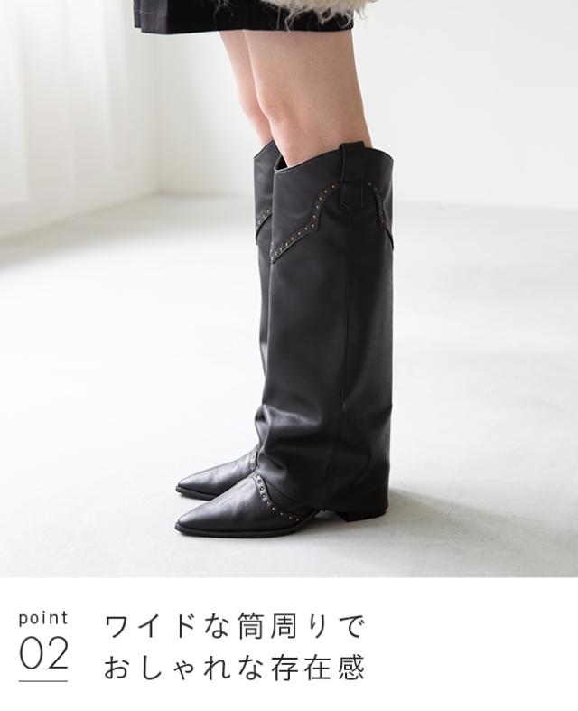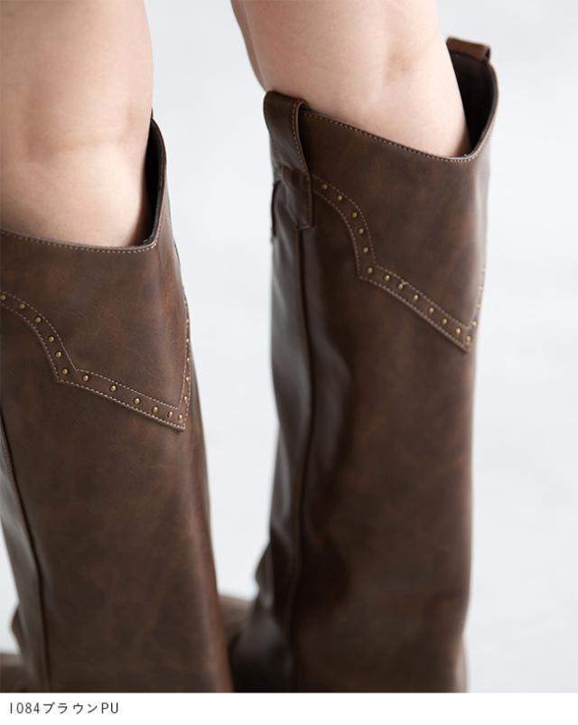 ロングブーツ レディース ウエスタンブーツ 6cmヒール 痛くない ポインテッドトゥ ヴィンテージ風 スタッズ ワイド 送料無料
