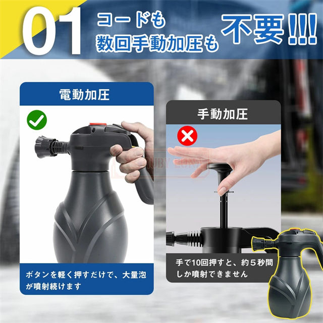 | 【電動蓄圧式】 | ◆電動 フォームガン電気圧力ボタンを軽く押すだけです。 ◆泡噴霧器を使用すると、粘着性のある雪の泡が大量に生成されることがあります。泡は均一で豊かです。 ◆完全に充電すると、3000mahの電力を持っています。複数の車両を簡単に掃除できます。 |