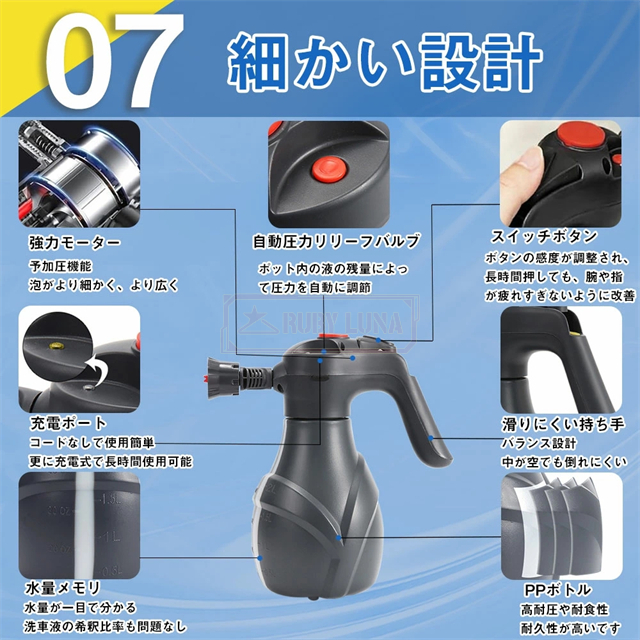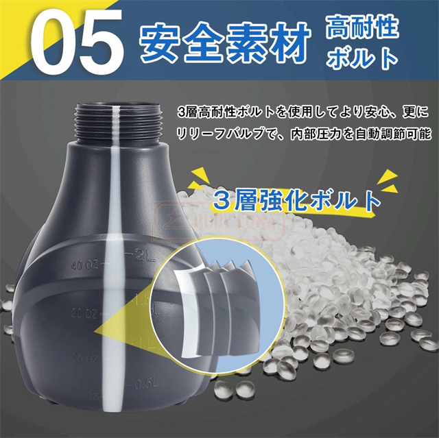 | 【細部にわたる設計の見直しと改善】 | ◆本製品に搭載している予圧機能によって、一般的な多くのスプレーボトルでよく見られる、噴霧を開始するときの圧力不足の問題を解決しています。 ◆またスプレーボタンも改良しました。ボタンの感度も調整されており、長時間押しても指が疲れすぎないようになっています。 |