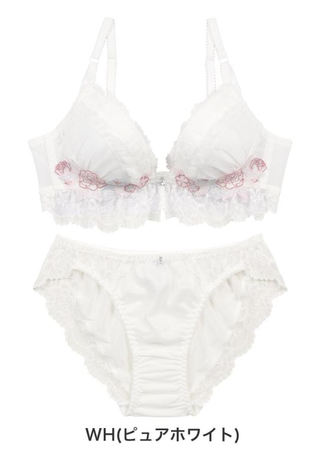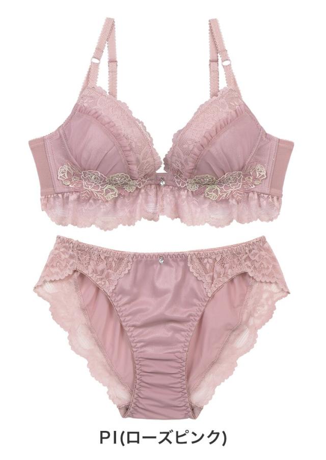 ラメ糸を使用した様々なバラのアップリケをカップを包み込むように配置。たっぷり使用したストレッチレースやフリルのディテールは女性の甘い色香をイメージしています。