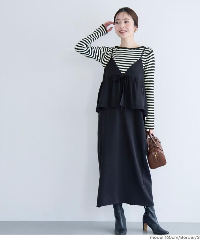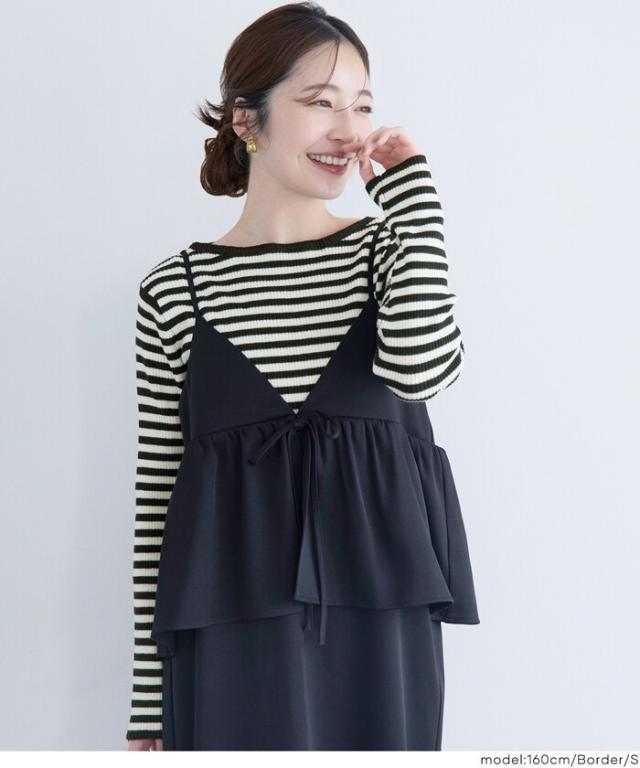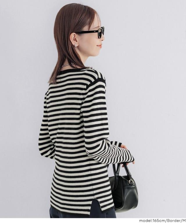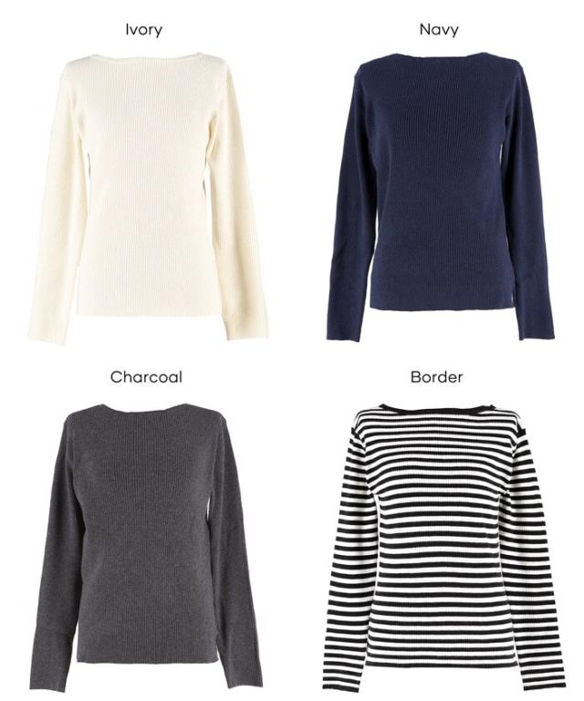 ボートネックで首元もすっきりとした印象に見せてくれます。