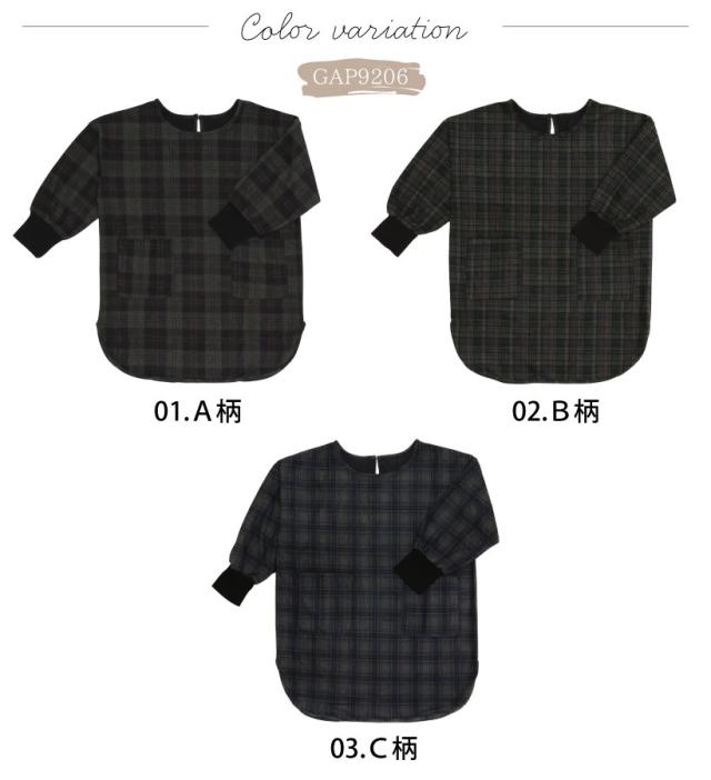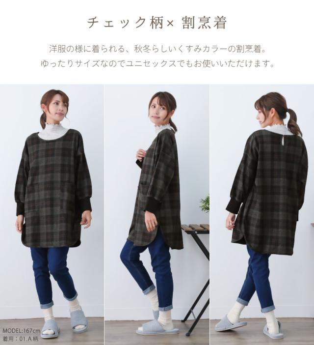 【圧縮メール便1枚のみ送料無料】チェック柄かっぽう着 リブ袖 おしゃれ チェック グレー ブラック ゆったり ポケット おしゃれ ギフト プレゼント【P】【M】