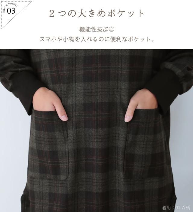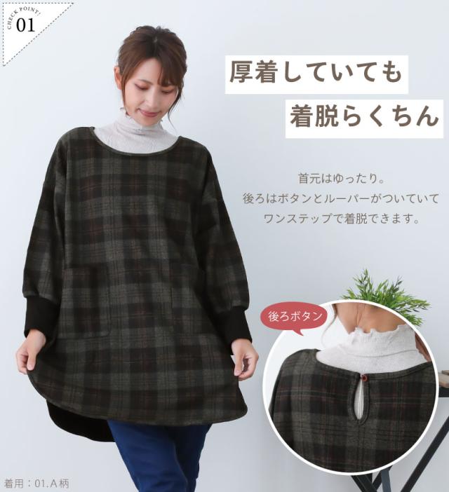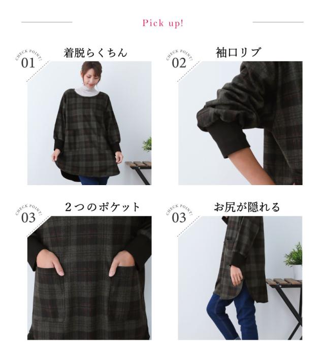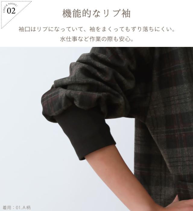 洋服のように着られるファッショナブルな割烹着。 秋冬らしい落ち着いたカラー配色と 様々なチェック柄がデザインされた一枚。リブ仕様の袖は、水仕事ににもピッタリ! デイリーにお使いいただけるおすすめカッポーギです。