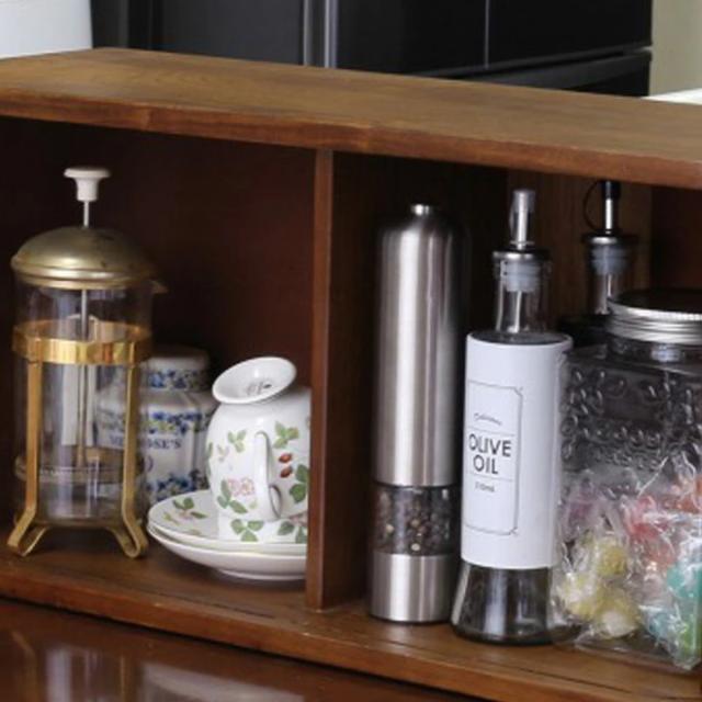 キッチンまわりをすっきり片づけるのはもちろん、床に置くと生活感むき出しでホコリも溜まってしまう普段使いの調味料や小物をサッと隠して扉を閉めれば、生活感を見せずに美しく保てます。