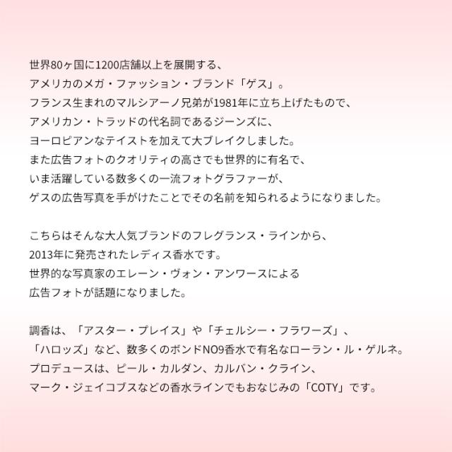 こちらはそんな大人気ブランドのフレグランス・ラインから、2013年に発売されたレディス香水です。世界的な写真家のエレーン・ヴォン・アンワースによる広告フォトが話題になりました。20代の女性をターゲットにした作品で、香りはキュートなフルーティー・フローラルの香調がベース。あかぬけたフェミニンと、情熱的なセクシーさをあわせ持つ、ハイ・ガーリーな一品に仕上げられております。