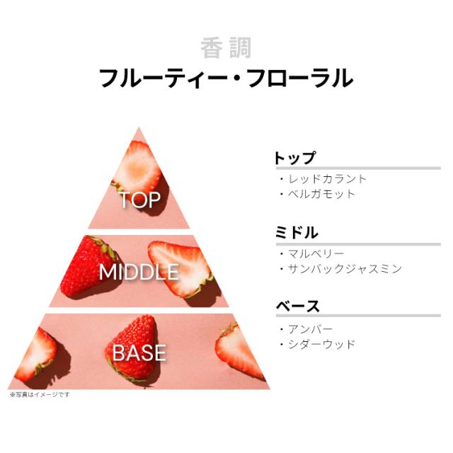 レッド・カラントやベルガモットなどが、ピュアでキュートなフルーティー・ノートを香り立たせるトップから、