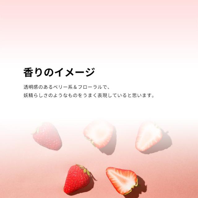 透明感のあるベリー系&フローラルで、妖精らしさのようなものをうまく表現していると思います。ボトルやボックスもエレガントなデザイン。バレエ・シューズに見たてたキャップや、ネックのデザインなどがステキです。