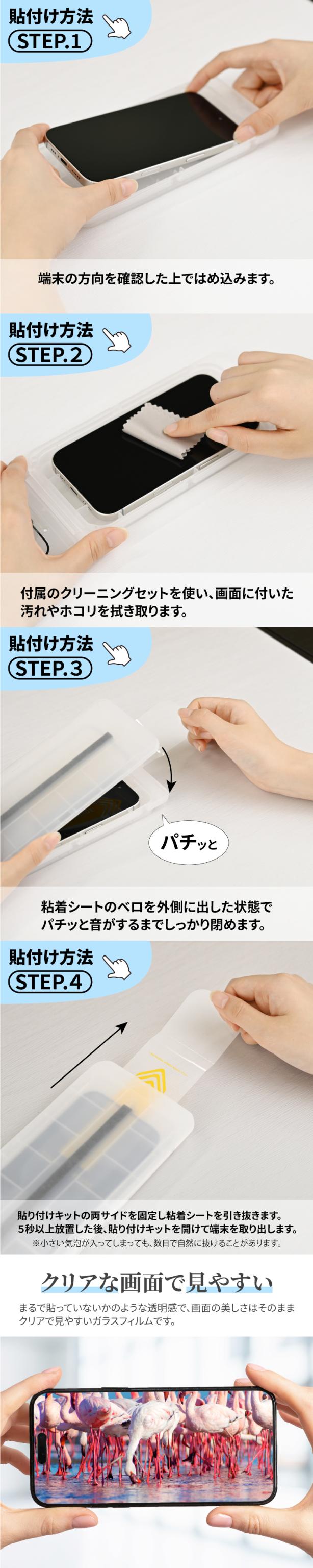 ステップ4 貼付けキットの両サイドを固定し粘着シートを引き抜きます。4秒以上放置した後、貼付けキットを開けて端末を取り出します。