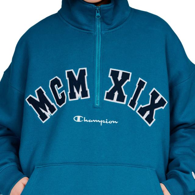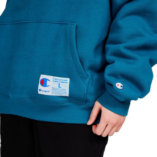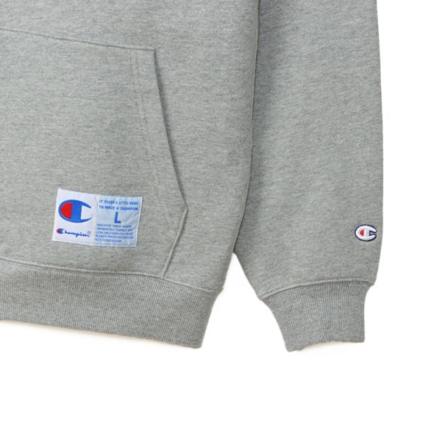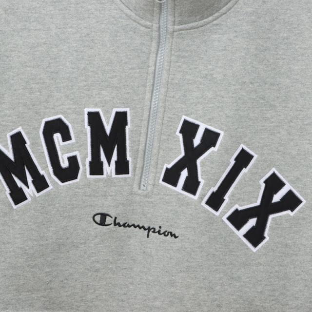胸にはChampionロゴ刺繍と、チャンピオンの創設年である1919年をローマ数字で表現した「MCMXIX」のフェルトアップリケ入り。