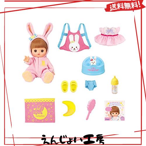 セット内容:ネネちゃん(パンツ付)、うさぎベビーオール、ベビーキャリア、ワンピース、おむつ、ベビーチェア、ブラシ、ミルクびん、おふとん、まくら、くつ、はじめてガイド、おせわてちょう