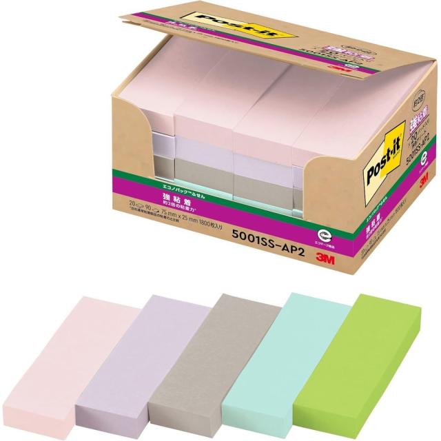 (まとめ買い)スリーエム ポストイット 強粘着ふせん 再生紙 パステルカラー5色 90枚×20パッド 75×25mm 5001SS-AP2 〔×3〕 【北海道・沖縄・離島配送不可】