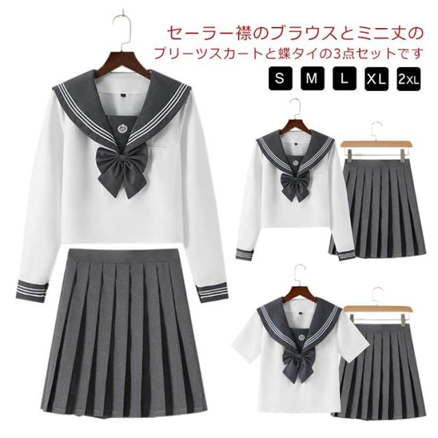 制服 コスプレ セーラー服 衣装 コスチューム JK 学生服 蝶タイ付き!女子高生 仮装 セーラーブラウス セーラーカラー 長袖 プリーツスカート リボン 半袖 オールシーズン 七五三 入学式 誕生日 入学式